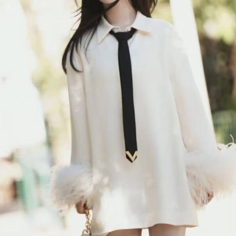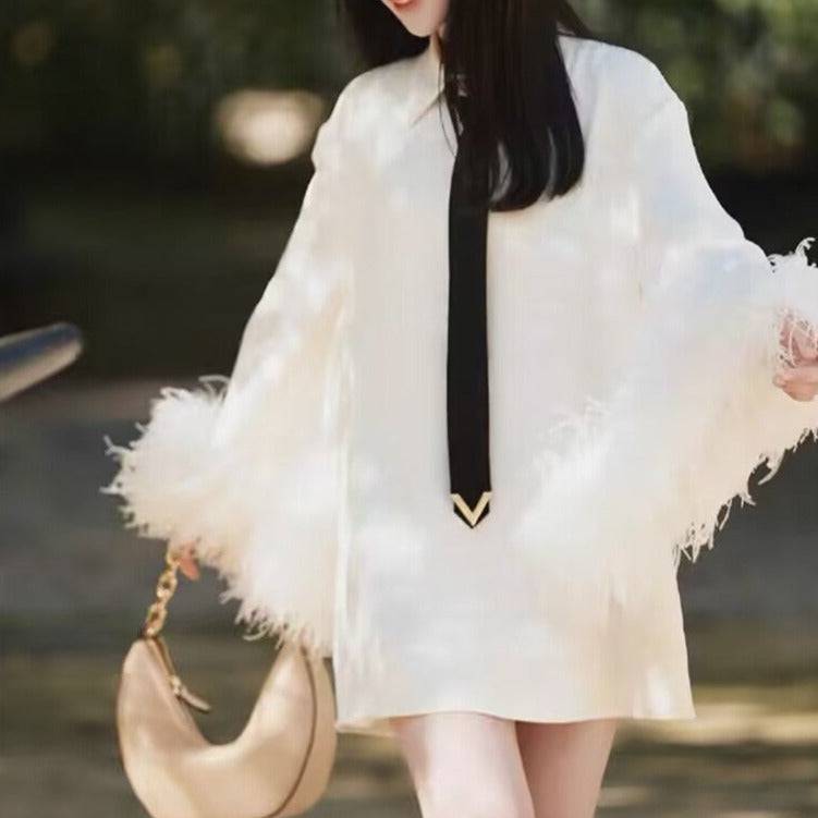 - The combination of fluffy long sleeves and a collared neckline creates a unique and eye-catching look.