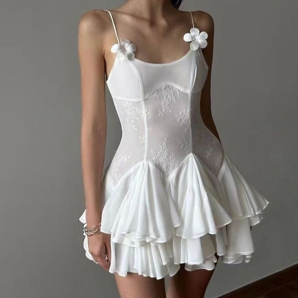 The Jane Sleeveless Floral Lace Ruffle Hem Mini Dress embodies feminine charm and delicate elegance. perfect for romantic occasions and summer soirées. Crafted with intricate floral lace and adorned with a cascading ruffle hem. this dress exudes whimsical grace and timeless sophistication.