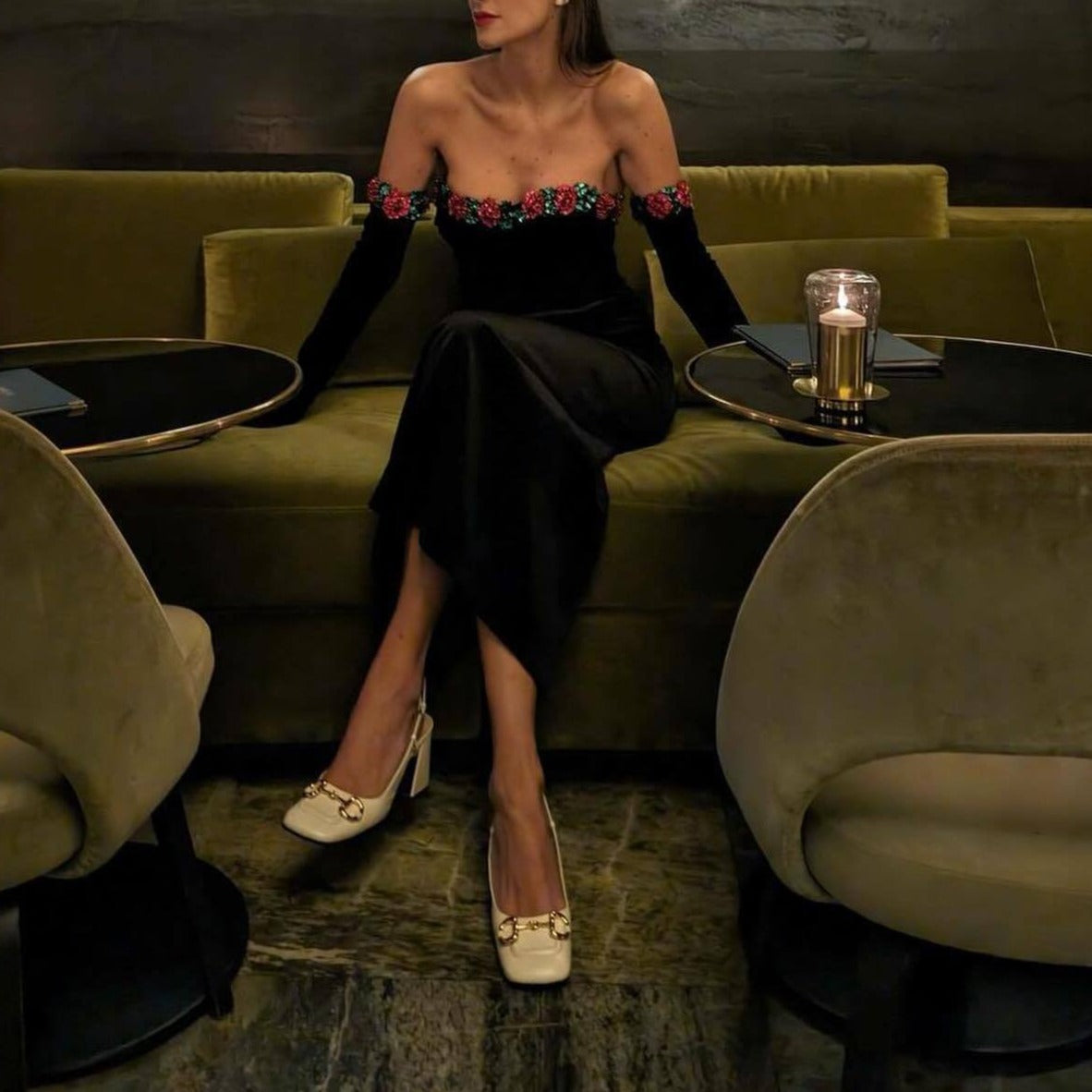 Crafted from luxurious velvet fabric. this dress exudes opulence and elegance. The off-shoulder neckline adds a touch of romance. delicately framing the shoulders and collarbones while showcasing your feminine grace.