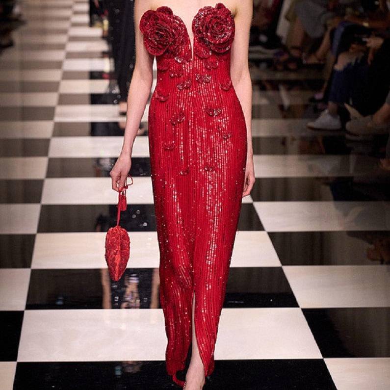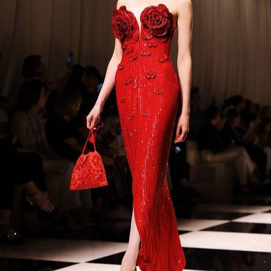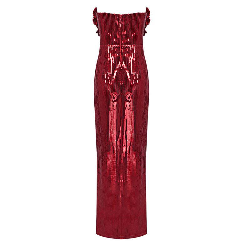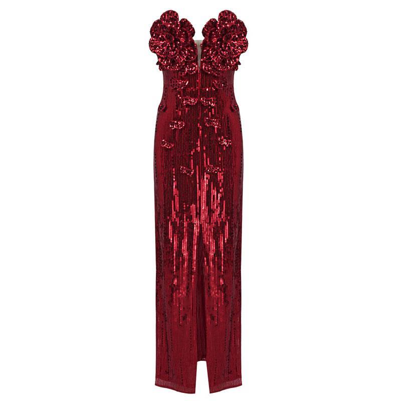 Introducing the Kacey Sequined Flower Detail Slit Maxi Dress �a stunning and elegant gown that seamlessly combines sequins. floral accents. and a daring slit for a show-stopping look.