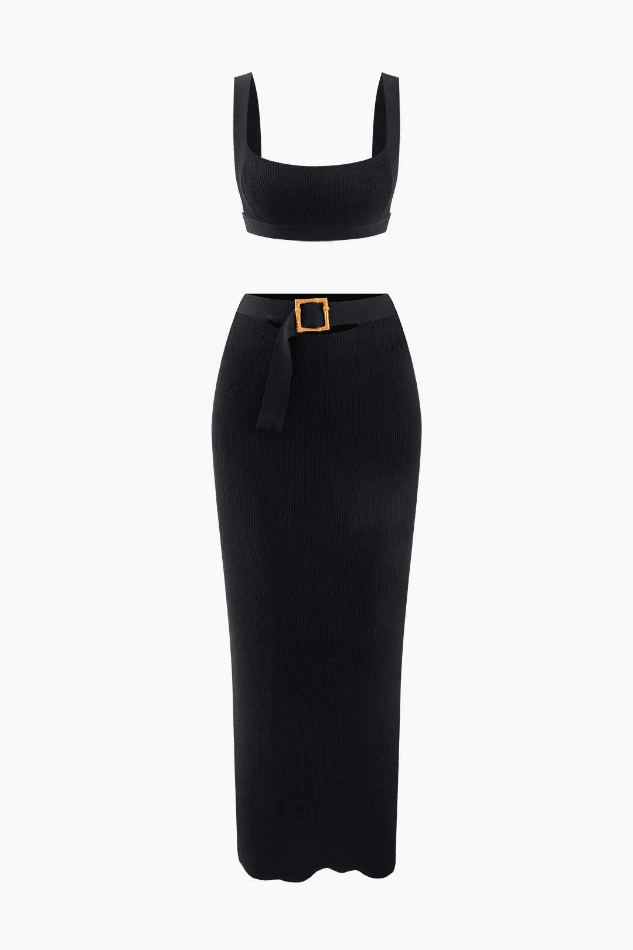 Knit Square Neck Crop Tank Top And Buckle Midi Skirt Set
