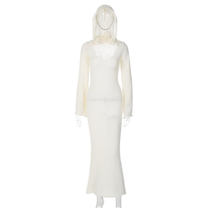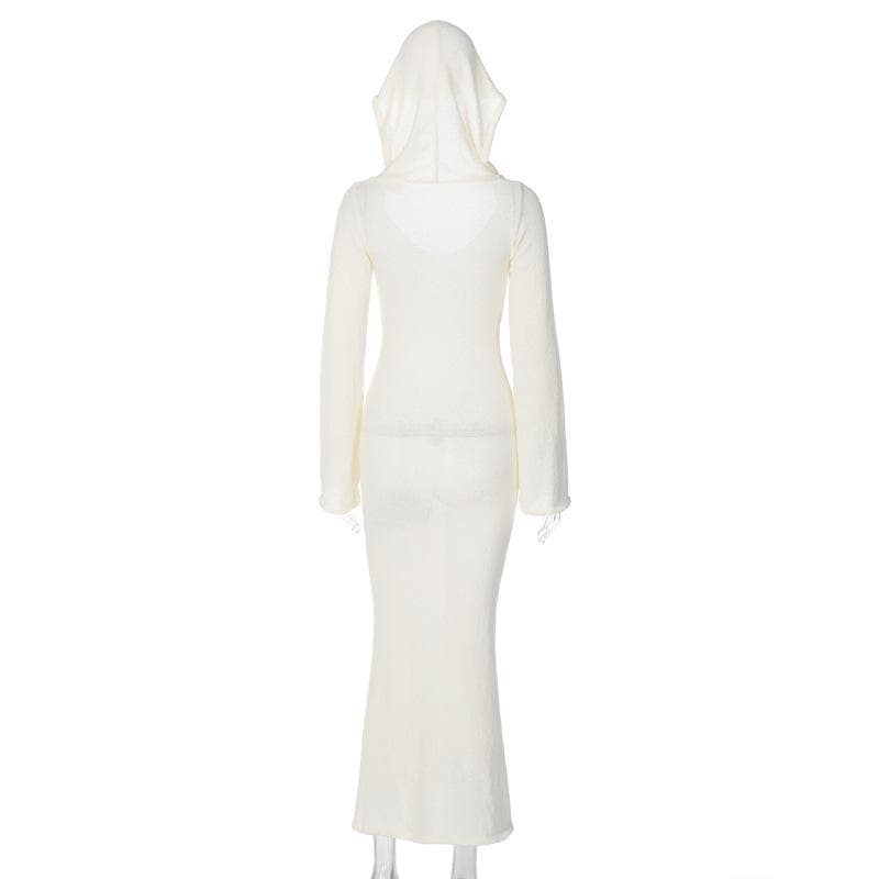 Knitted solid hoodie u neck long sleeve maxi dress