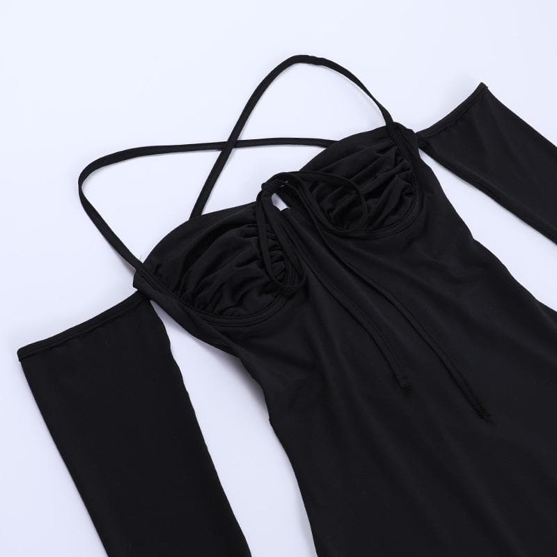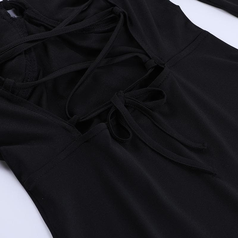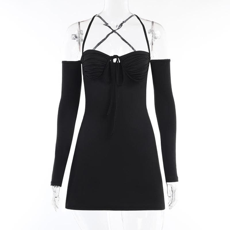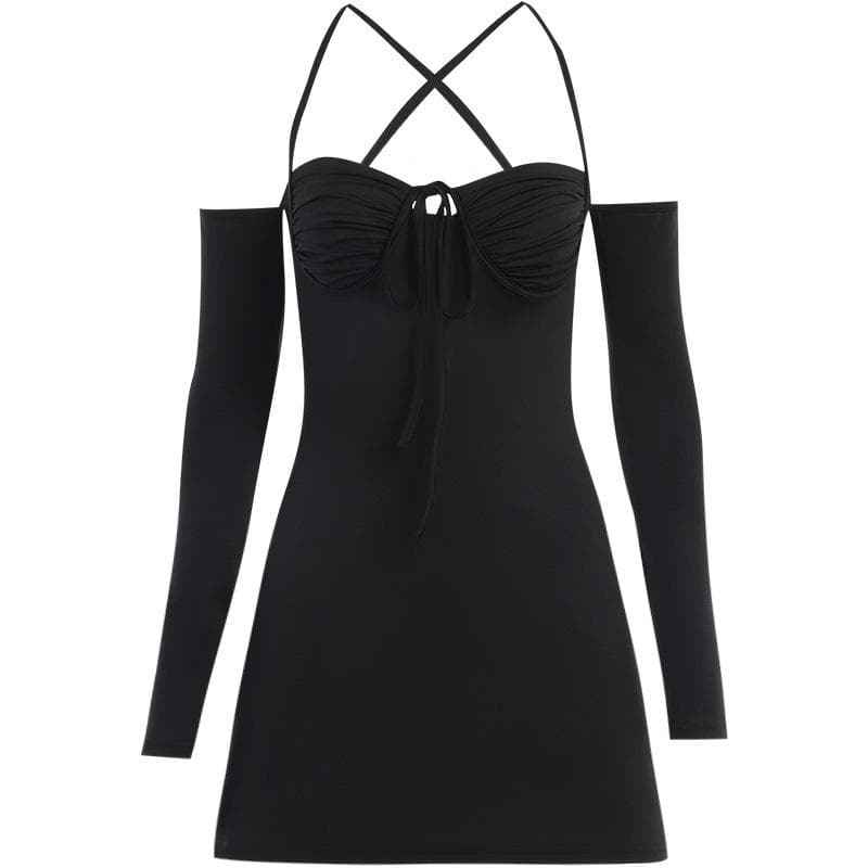 Lace up solid cross back off shoulder long sleeve mini dress