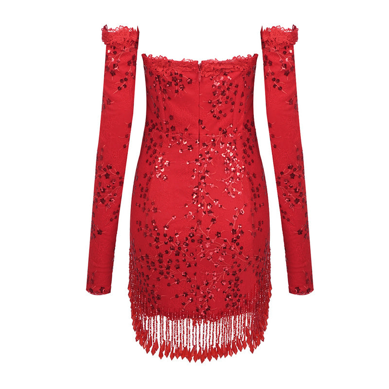 Step into the spotlight with the Laurie Crystal Tassel Sequin Patchwork Lace Mini Dress in ravishing red. a dazzling ensemble that exudes glamour and allure. This exquisite dress is a celebration of opulence and sophistication. designed to make a bold statement at any upscale event.