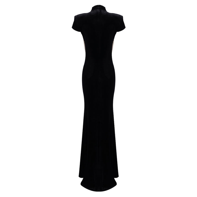 The highlight of this exquisite dress is the delicate pearl chain detail adorning the neckline. adding a touch of luminous sophistication. Each pearl glistens against the backdrop of velvet. creating a mesmerizing contrast that draws the eye and elevates the overall allure of the ensemble.