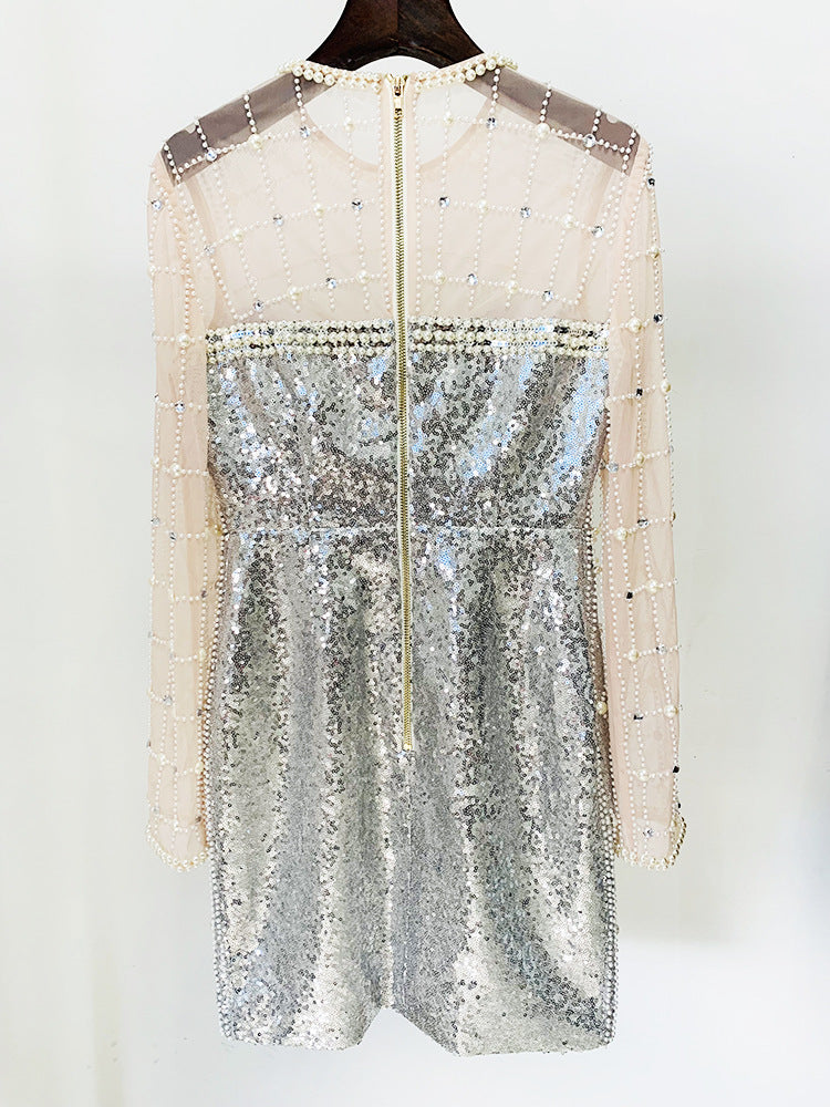 - With its delicate pearl embellishments. long sleeves. and mini length. the Lucinda dress exudes timeless elegance and sophistication.