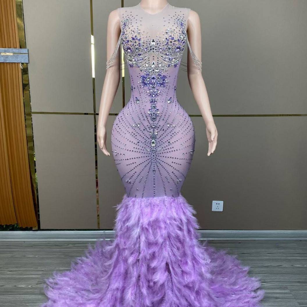 Chic Sleeveless Style: With a sleeveless design. the dress exudes contemporary chic and allows for unrestricted movement. The sleeveless style adds a touch of sophistication while ensuring the focus remains on the captivating see-through. rhinestone. and feather details.