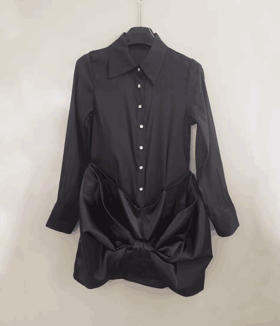Crafted from high-quality fabric. this dress features a unique asymmetric design that adds a contemporary twist to a classic silhouette. The button-up front lends a touch of vintage charm. while the ribbon detailing along the asymmetrical hemline adds a playful and feminine touch.