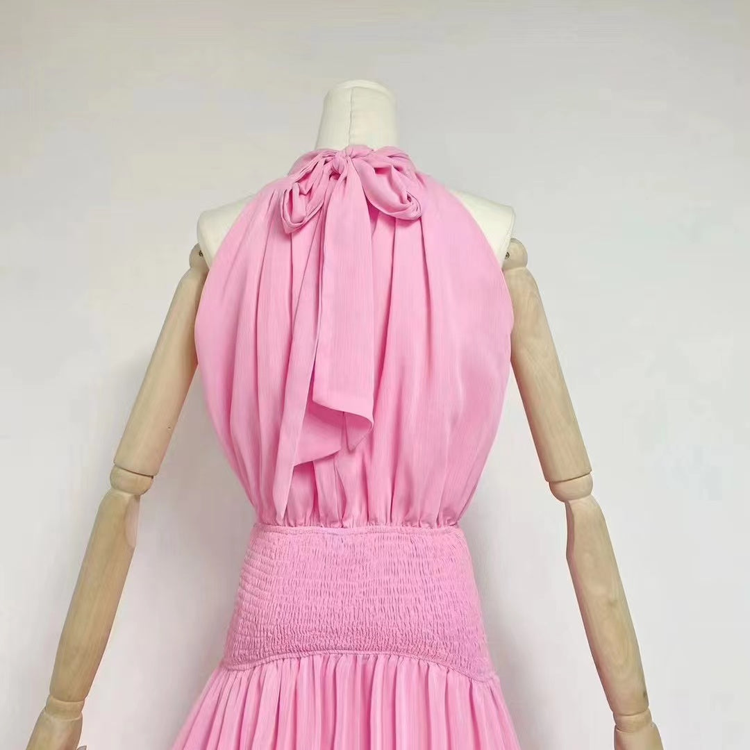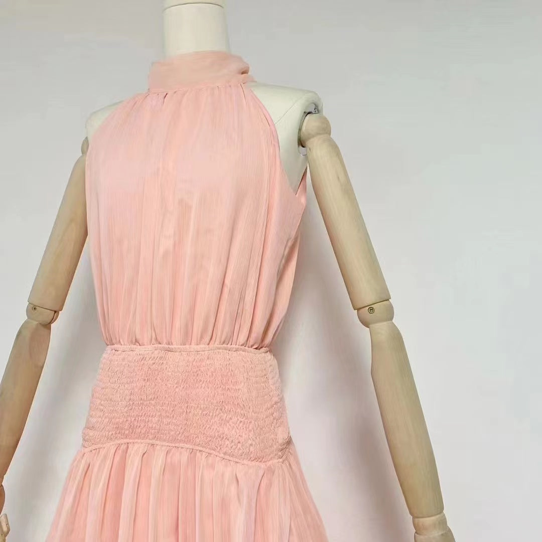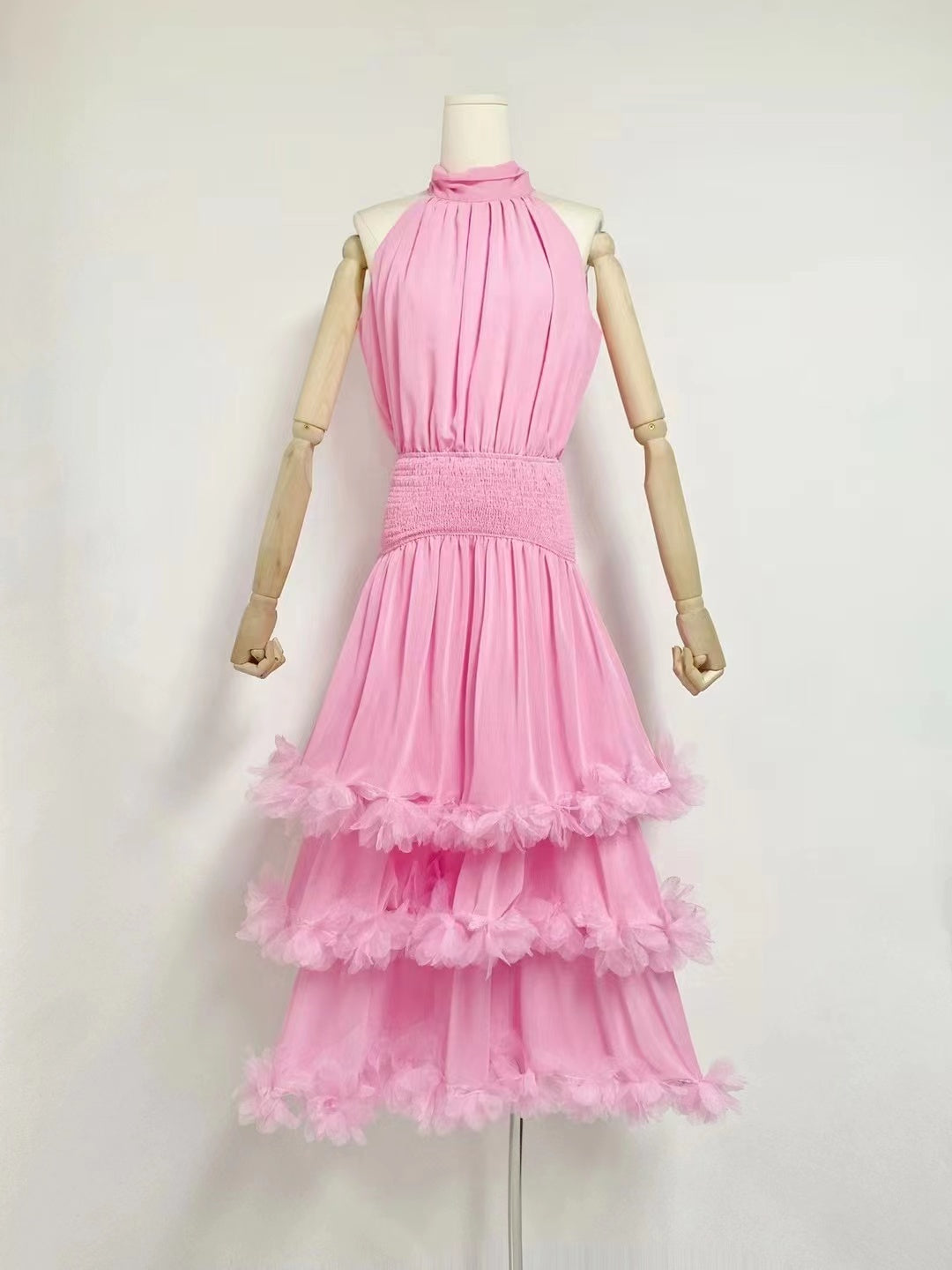 Crafted from luxurious chiffon fabric. the Meadow Evening Gown features a halter neck design adorned with delicate ruffle detailing. adding a touch of whimsy and elegance. The tiered skirt cascades gracefully to the floor. creating a dreamy and ethereal silhouette that floats with every step.