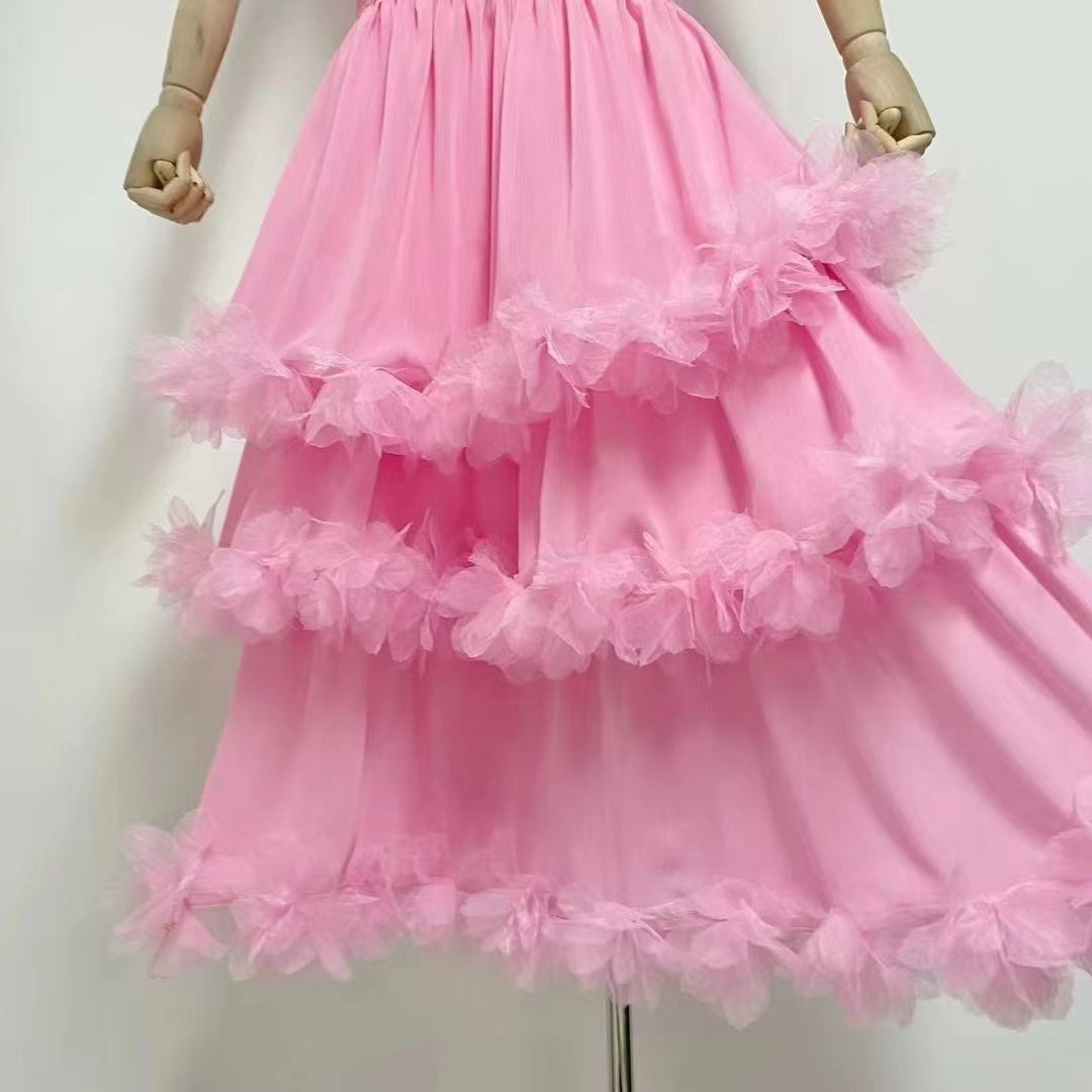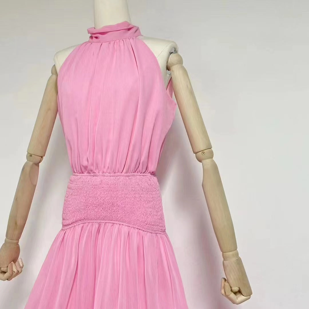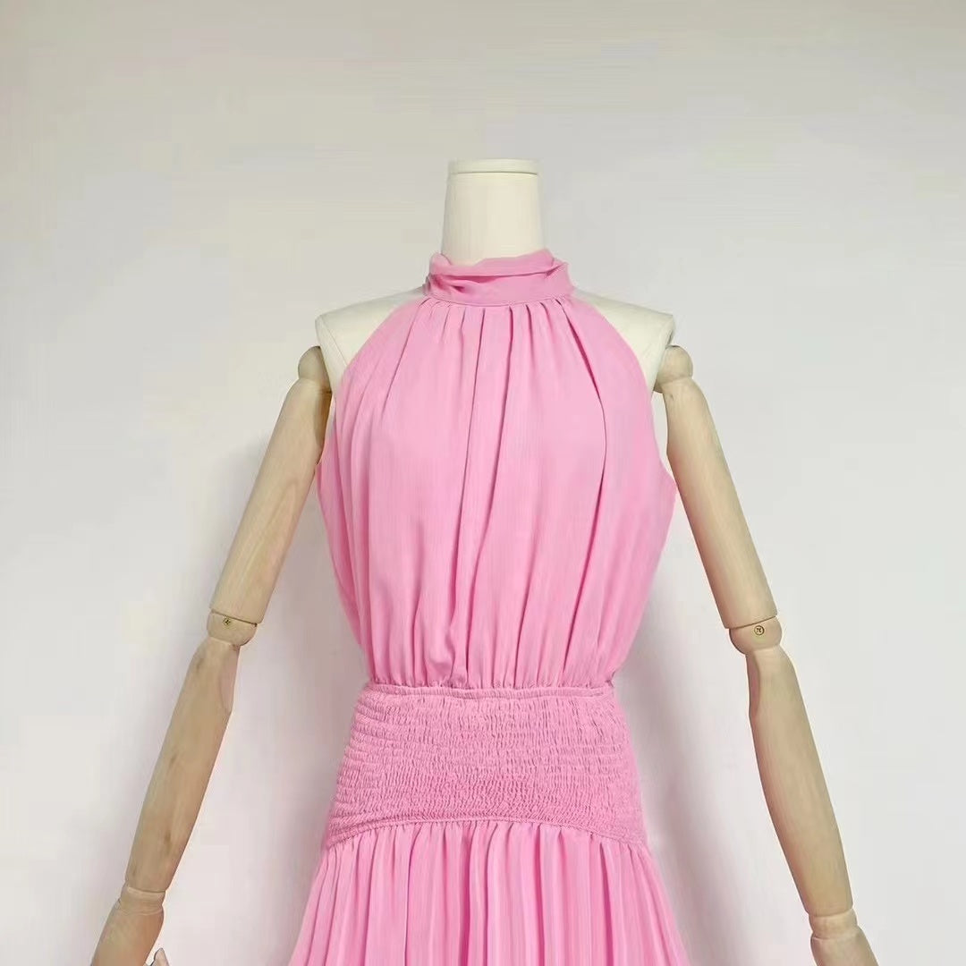 Crafted from luxurious chiffon fabric. the Meadow Evening Gown features a halter neck design adorned with delicate ruffle detailing. adding a touch of whimsy and elegance. The tiered skirt cascades gracefully to the floor. creating a dreamy and ethereal silhouette that floats with every step.