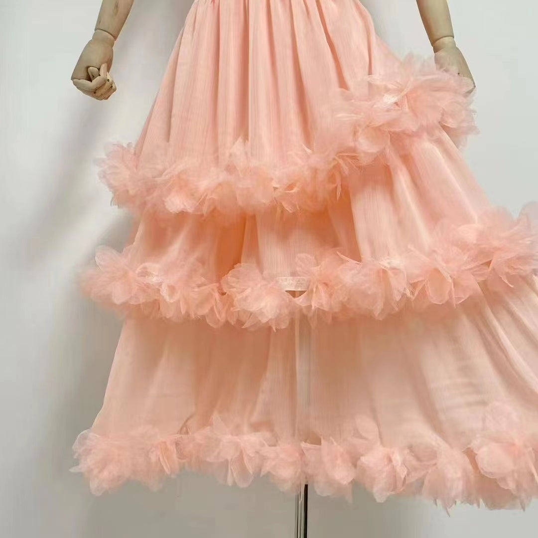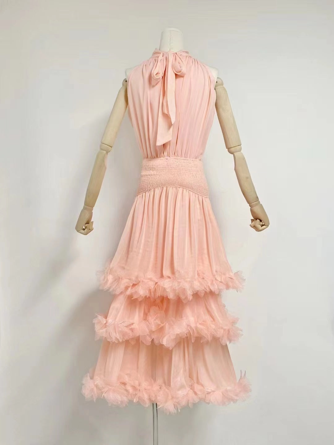 Suncoy Meadow Halter Neck Ruffle Tiered Evening Gown in Apricot and Pink. a breathtaking ensemble that exudes grace and charm. This exquisite gown seamlessly blends romance with sophistication. making it the perfect choice for your most memorable occasions.