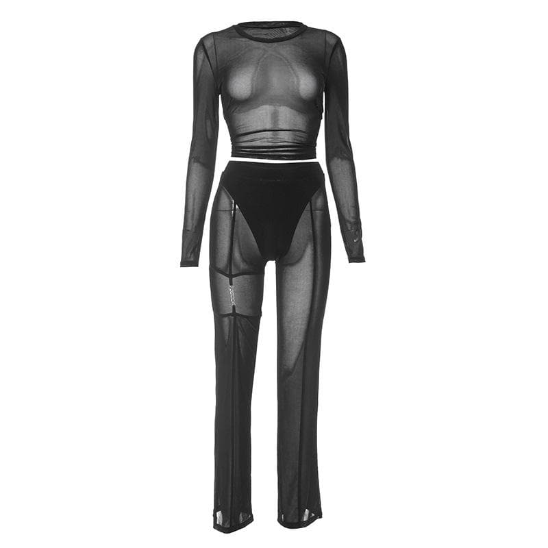 Mesh see through hollow out long sleeve solid pant set