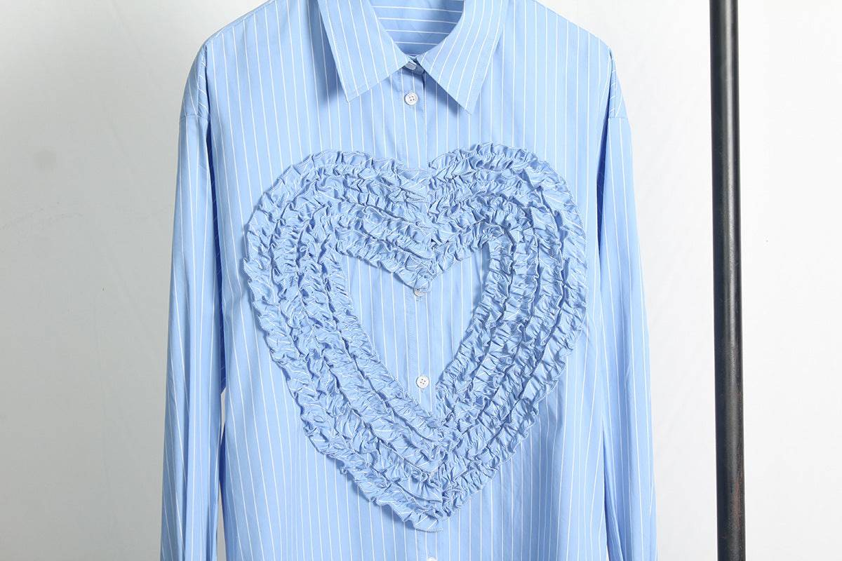Versatile Styling: Whether paired with jeans for a relaxed weekend look or tucked into a pencil skirt for a more polished appearance. the Micaela Striped Ruffle Heart Embroidered Shirt Top allows for versatile styling. adapting effortlessly to your unique fashion preferences.