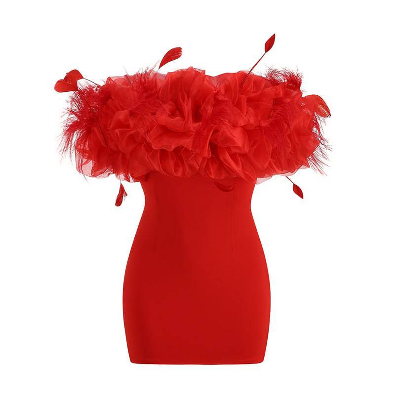 Versatile Styling: Whether you pair it with statement heels for a night of dancing or dress it down with chic flats for a daytime event. the Mika Feather Trim Oversized Ruffle Mini Dress effortlessly transitions from day to night.