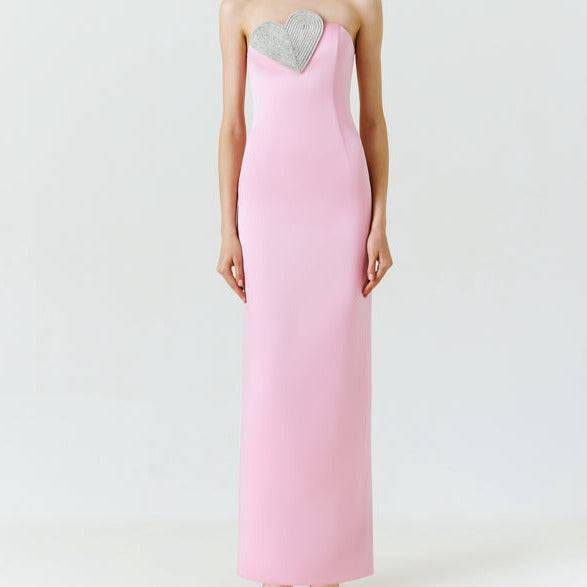 Immerse yourself in the timeless romance and modern sophistication of the Suncoy Millie Strapless Heart Embellished Cady Column Maxi Dress—a dress designed for the modern romantic who appreciates the beauty of delicate details and luxurious fabrics.