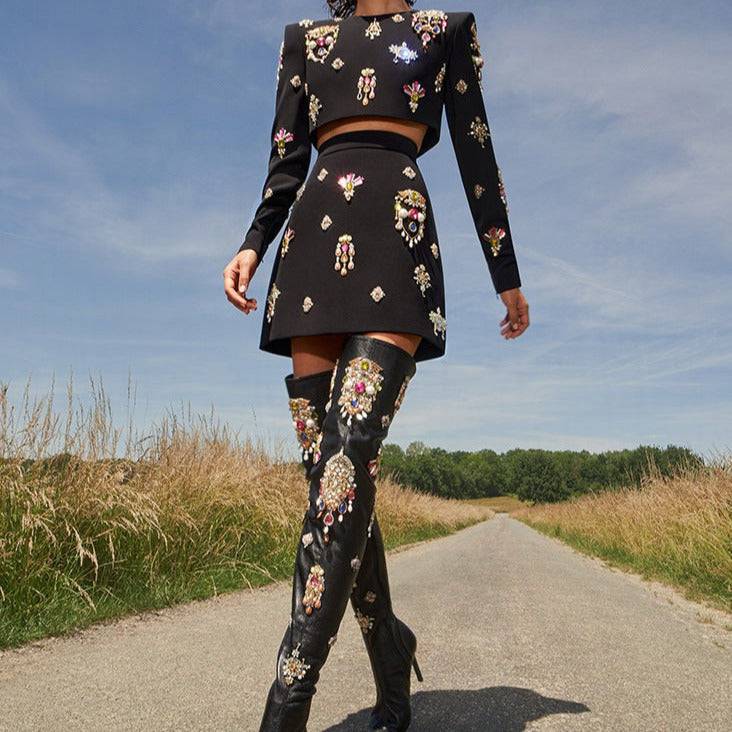 Immerse yourself in the vibrant sophistication and playful details of the Suncoy Misti Long Sleeve Colorful Diamond Bead Crop Top & Mini Skirt Set—a set designed for the modern woman who appreciates the fusion of bold style. youthful charm. and contemporary elegance.