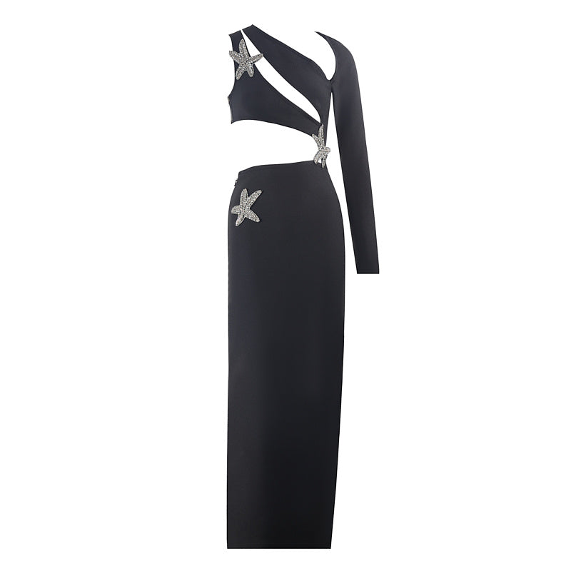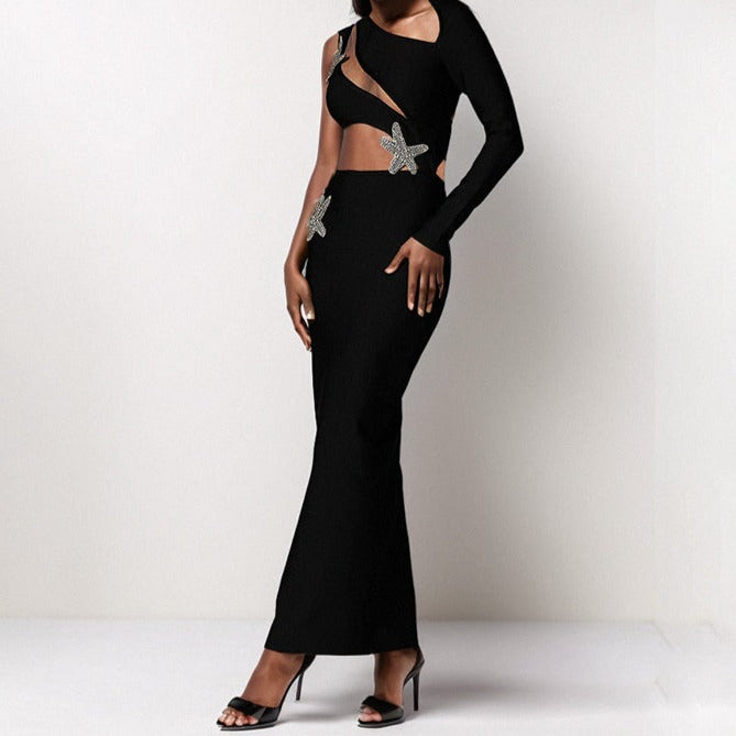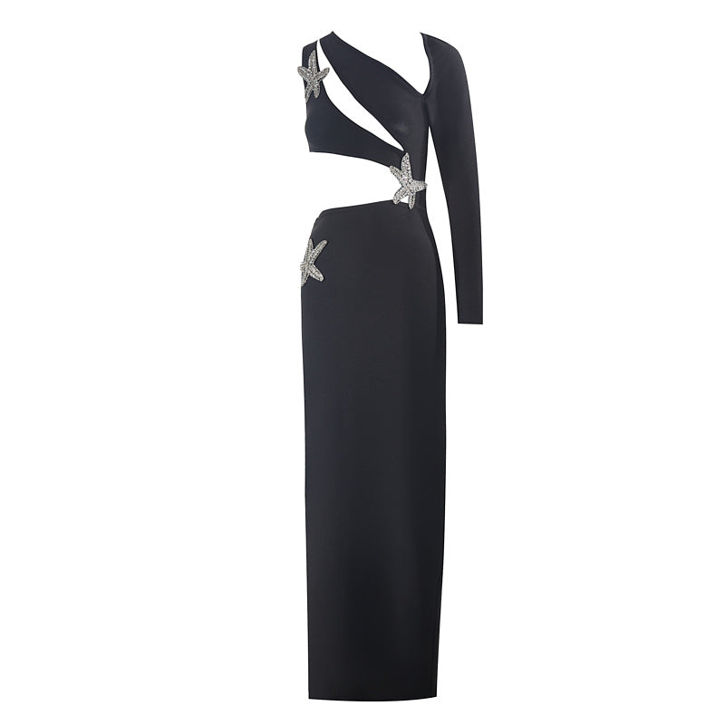 Introducing the Molly Hollow Diamond Starfish Maxi Dress. a stunning piece that brings together the elegance of a maxi dress with the whimsical charm of starfish-inspired embellishments. Perfect for beach weddings. summer soirées. or any special occasion where you want to shine. this dress features intricate hollow diamond cutouts and delicate starfish motifs. creating a look that is both enchanting and sophisticated.