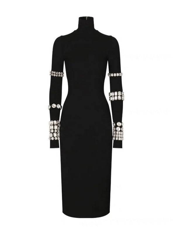 Crafted from high-quality materials. the dress not only looks luxurious but also feels comfortable against the skin. The fitted silhouette enhances your figure while providing a comfortable and flattering fit. Whether you're attending a cocktail party. a dinner event. or a special occasion. the Crystal Sleeves Turtle Neck Midi Dress in Black is sure to make a stylish statement. Pair it with heels and minimal jewelry for a refined and polished look that exudes confidence and sophistication.