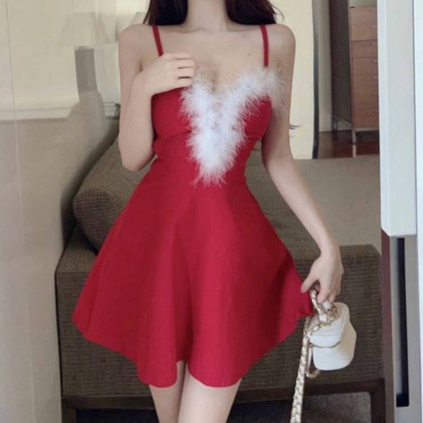Immerse yourself in the festive and contemporary details of the Suncoy Neely Strappy Fuzzy V Neck A-Line Christmas Mini Dress—a dress designed to spread holiday joy and celebrate the season with style.