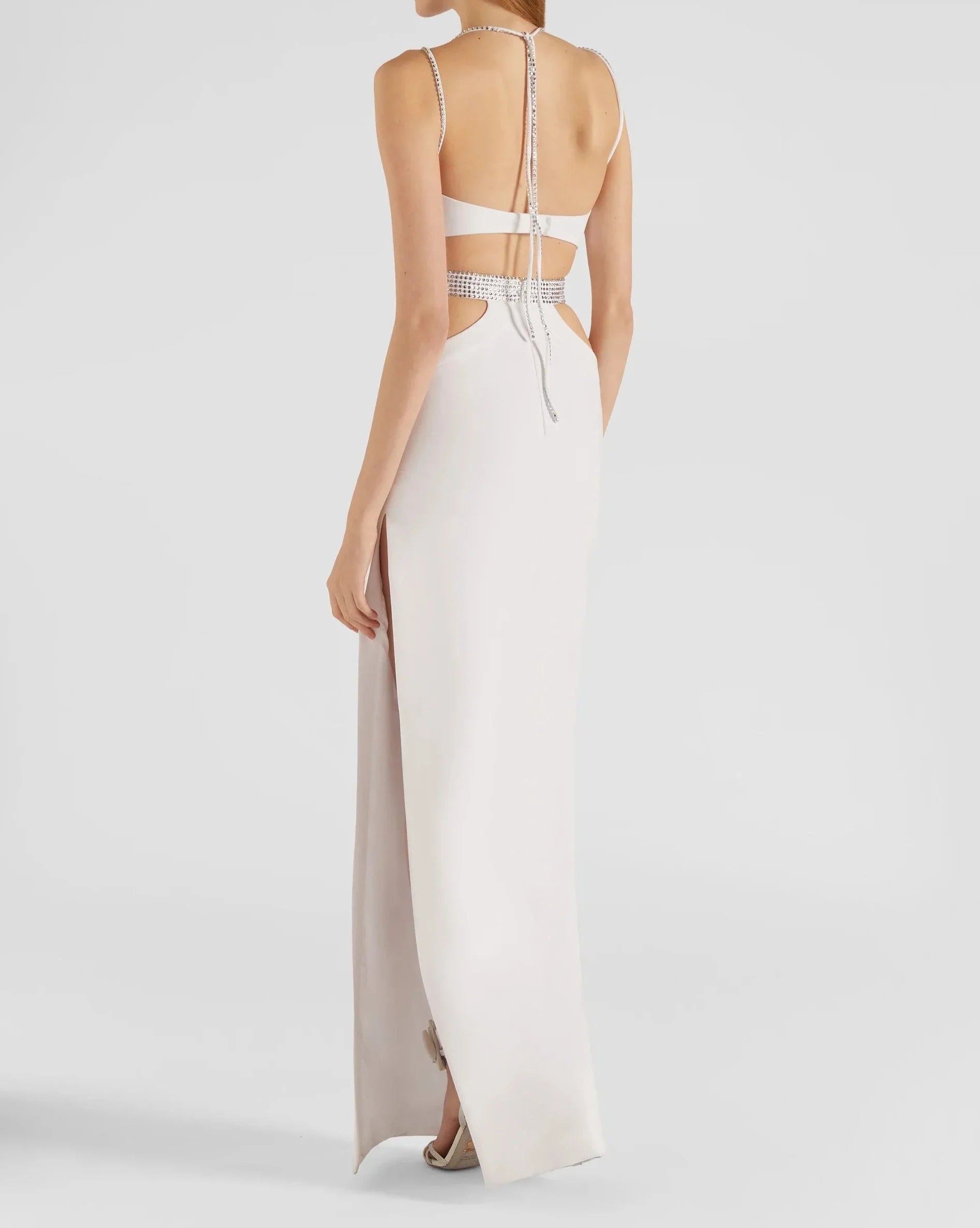 The Hollow Out Spaghetti Strap Diamonds Design Slit Dress in a radiant white hue is a show-stopping garment that seamlessly blends modern allure with classic sophistication. This dress is crafted to make a bold statement at special occasions. ensuring you stand out with elegance and grace.