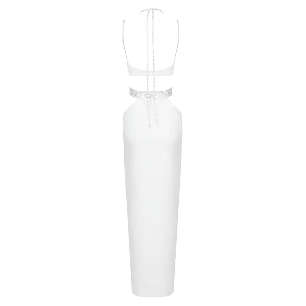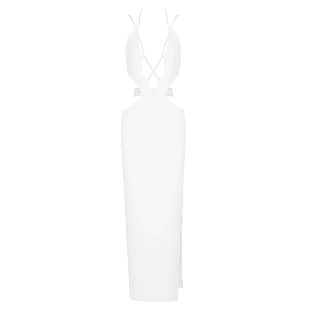 Embrace the allure of the Hollow Out Spaghetti Strap Diamonds Design Slit Dress in white for an unforgettable and enchanting look. Whether attending a red-carpet event. a glamorous soirée. or an upscale celebration. this dress is sure to command attention with its bold design and timeless sophistication.