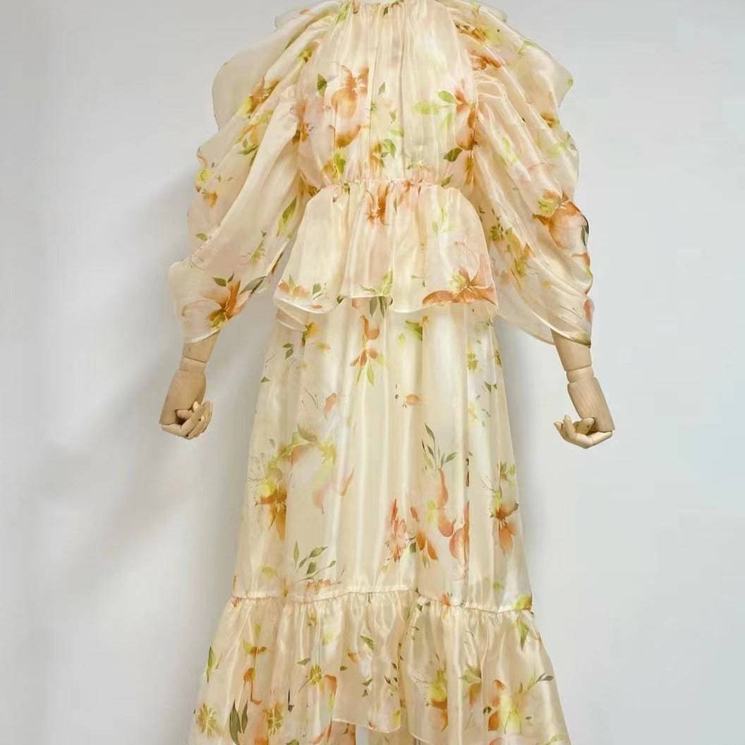 Floral Elegance: Immerse yourself in the beauty of a floral motif that graces the fabric of the dress. The carefully chosen floral patterns contribute to a sense of playful femininity. infusing the ensemble with natural charm and timeless grace.