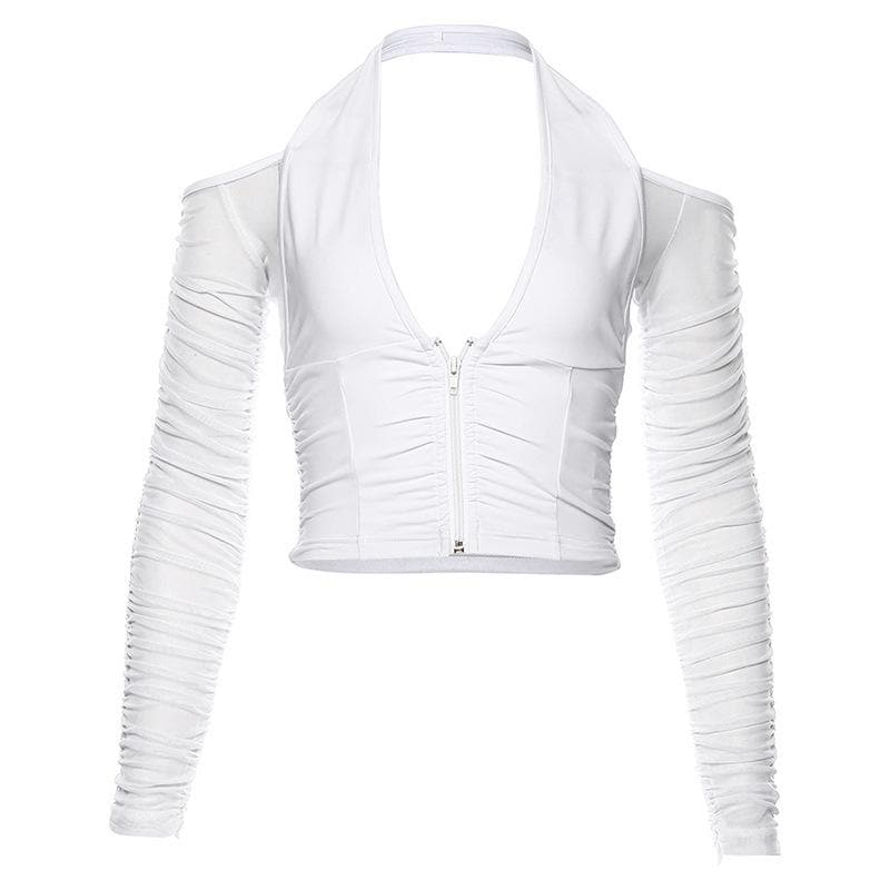 Off shoulder solid long sleeve mesh halter zip-up low cut crop top