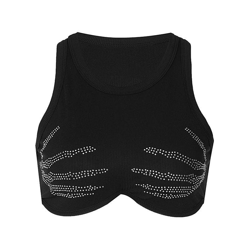 Palm pattern beaded ribbed sleeveless round neck crop top