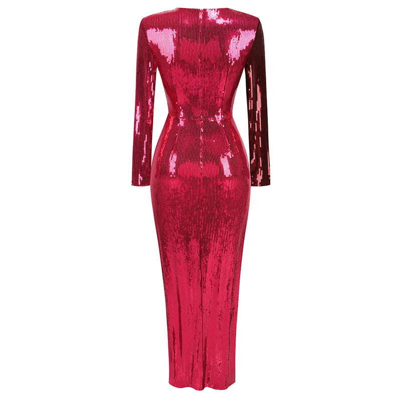 Crafted from luxurious fabric adorned with shimmering sequins. this gown catches the light with every step. creating a mesmerizing effect that commands attention. The figure-hugging silhouette flatters the curves. while the plunging neckline adds a hint of allure. perfectly balanced by the elegant high slit that reveals just the right amount of leg.