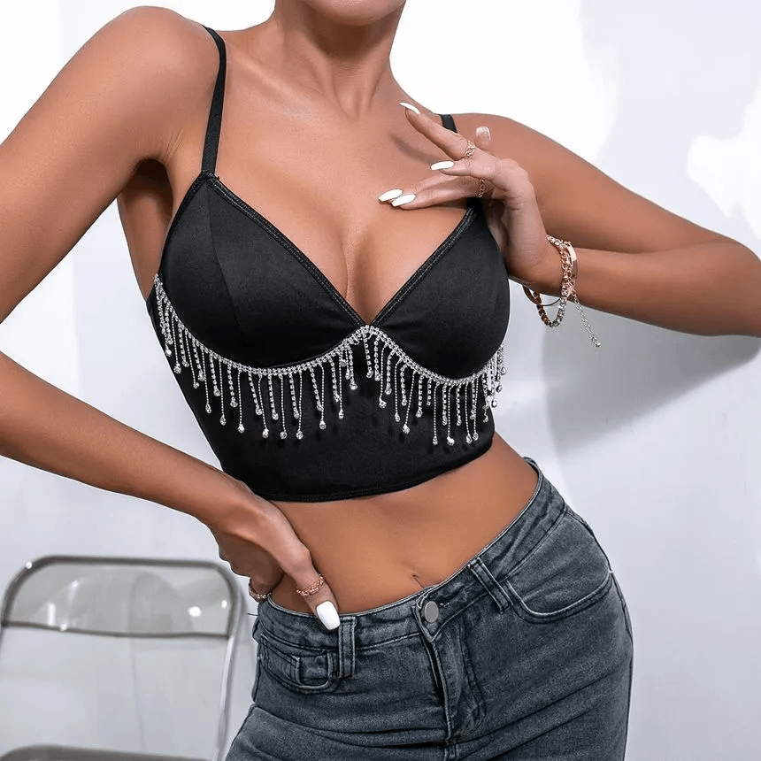 Patsy Spaghetti Strap Rhinestone Fringe Crop Bustier Top