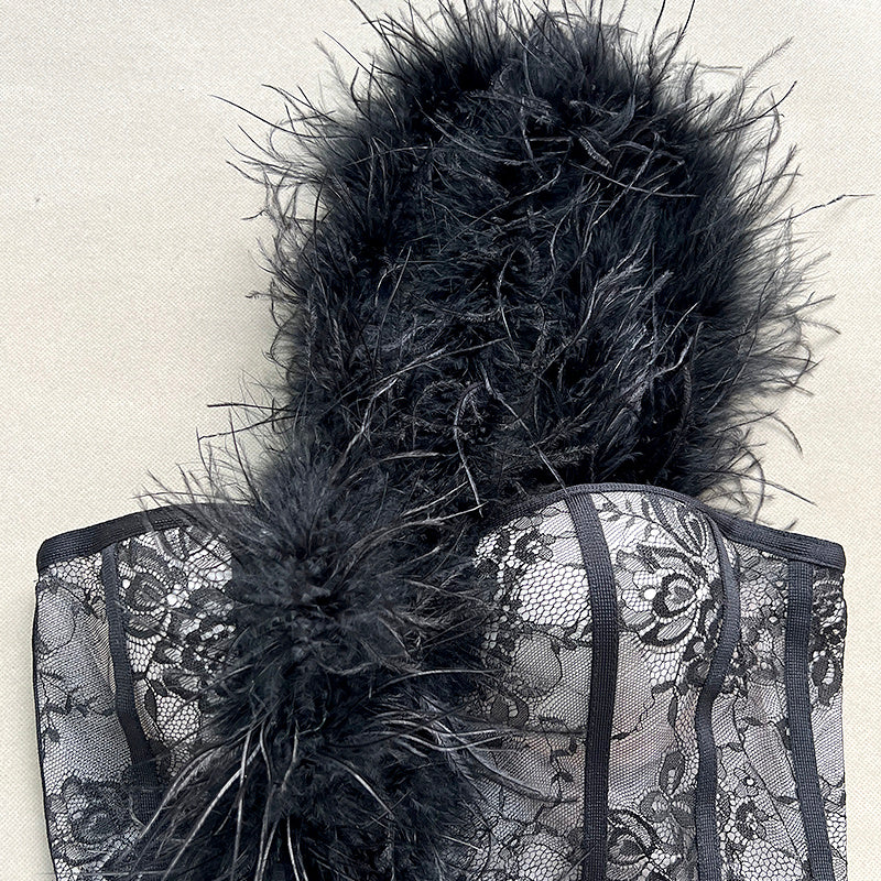 Crafted with meticulous attention to detail. the dress features a luxurious one-shoulder neckline. adding a touch of allure and intrigue to its silhouette. The delicate lace fabric. adorned with feather embellishments. creates a mesmerizing texture that catches the light with every movement. ensuring all eyes are irresistibly drawn to you.