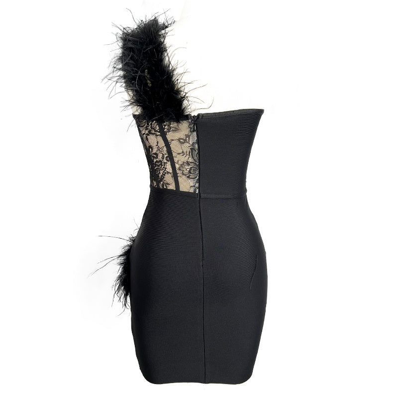 Embrace the power of timeless sophistication and undeniable allure with the Pearle One-Shoulder Feather Lace Mini Dress in black �a symbol of effortless elegance for the modern fashionista.