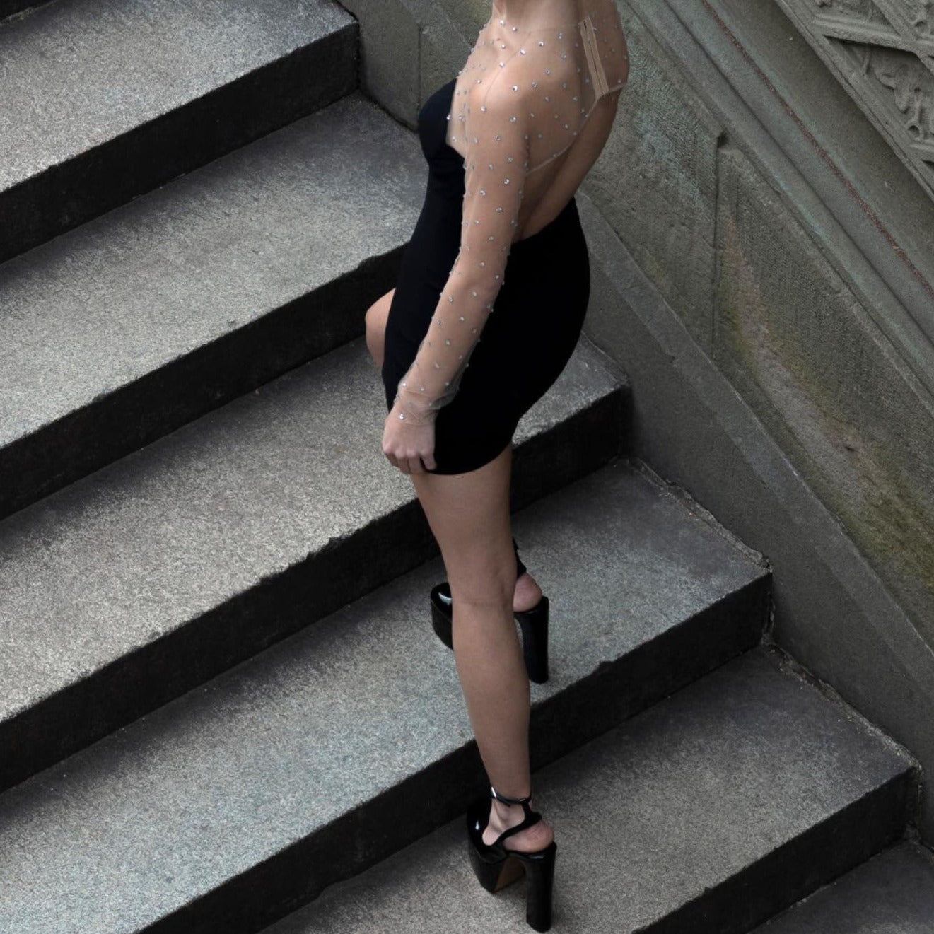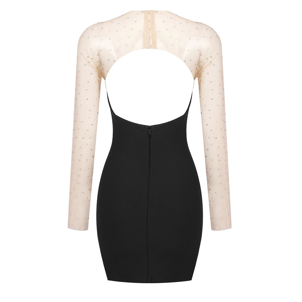 - With its crystal embellishments. long sleeve design. mesh fabric. mini length. and form-fitting silhouette. the Poppy dress exudes boldness and glamour.