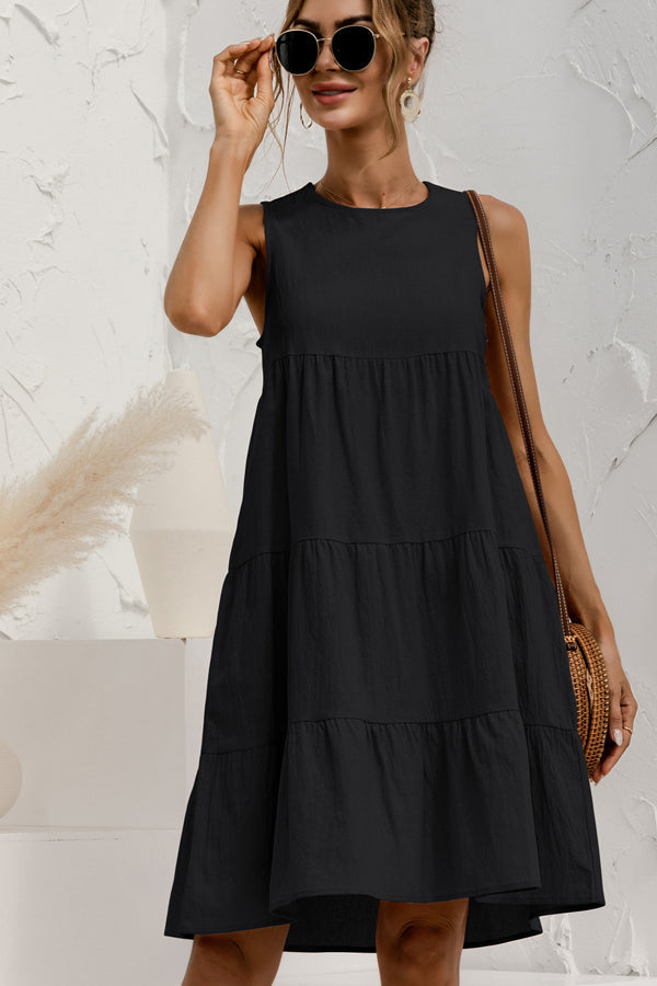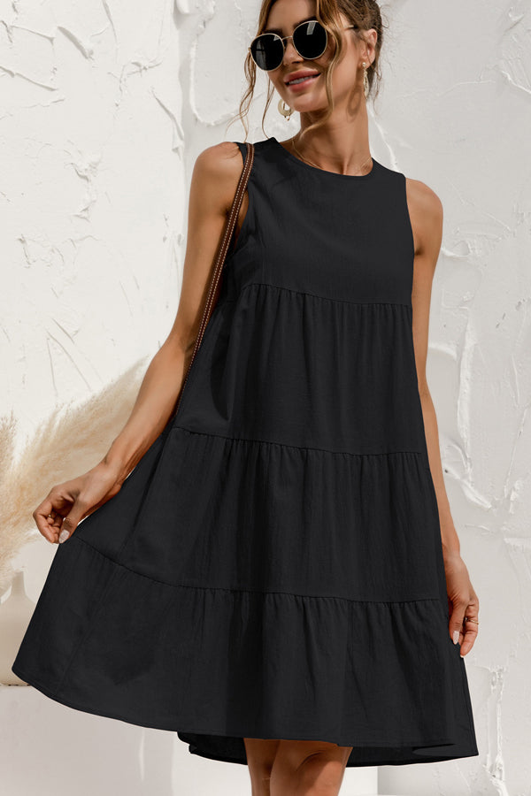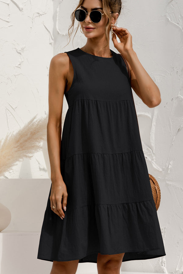 • Round Neck Solid Ruched Sleeveless Mini Dress