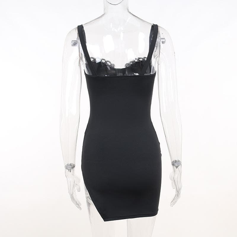 Ruched solid sleeveless lace slit self tie backless mini dress
