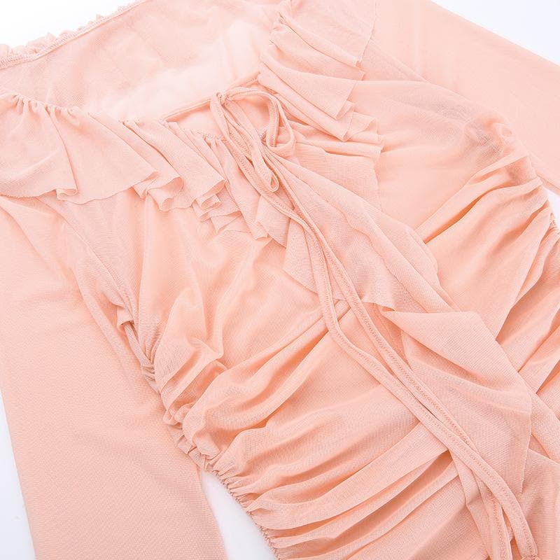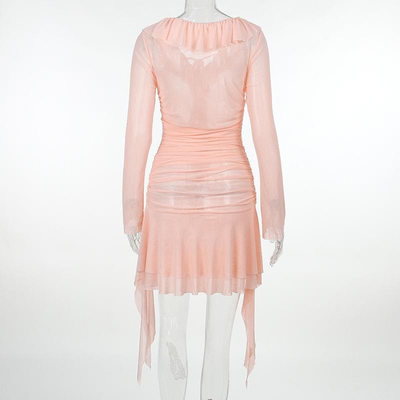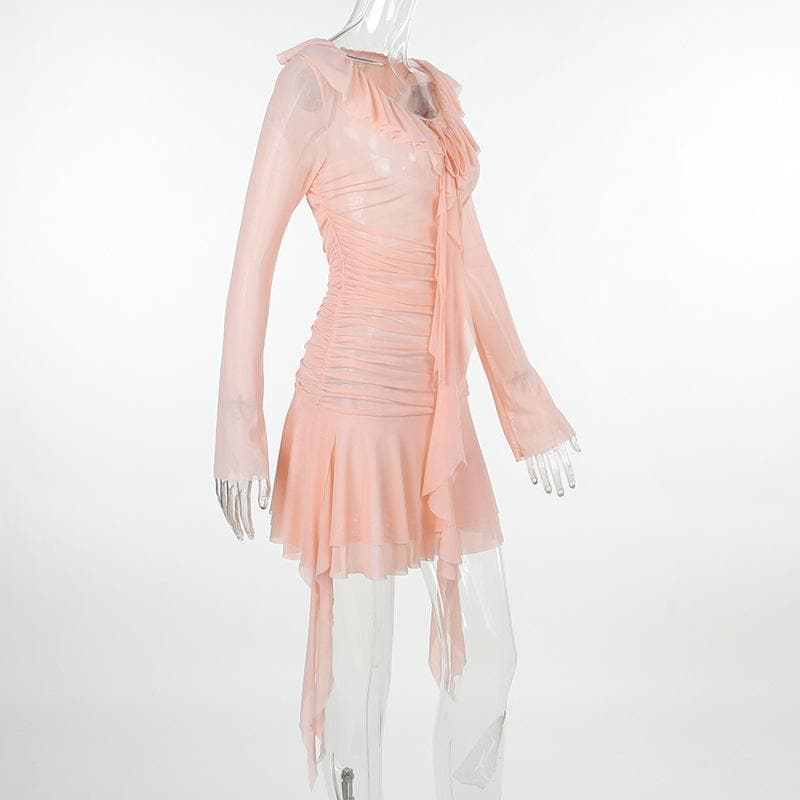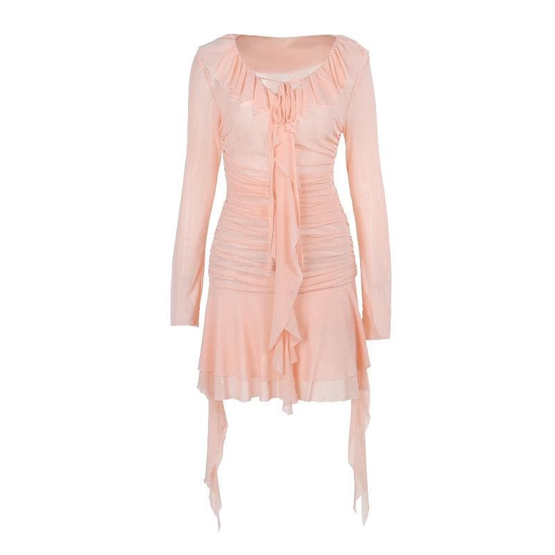 Ruffle solid self tie ruched long sleeve mesh mini dress