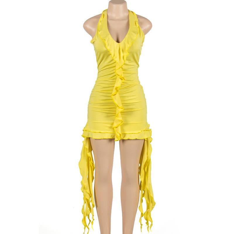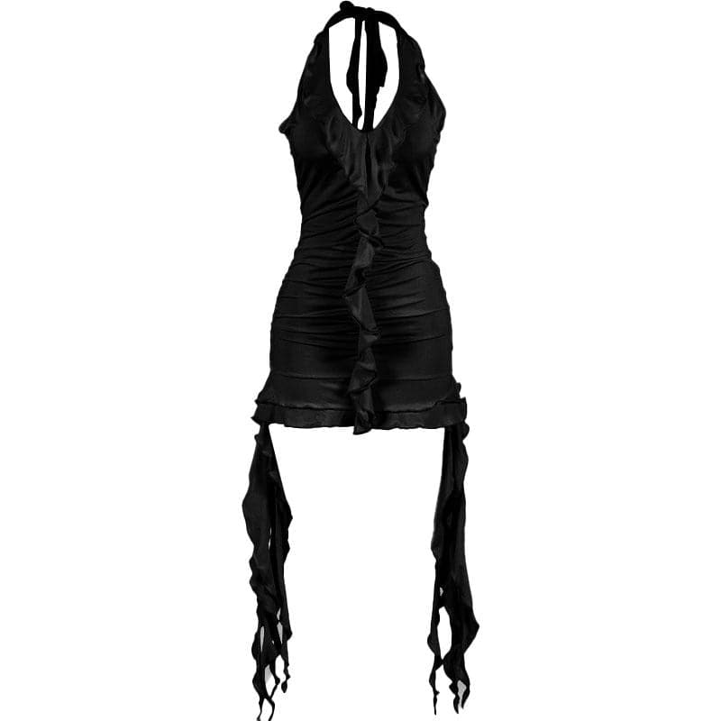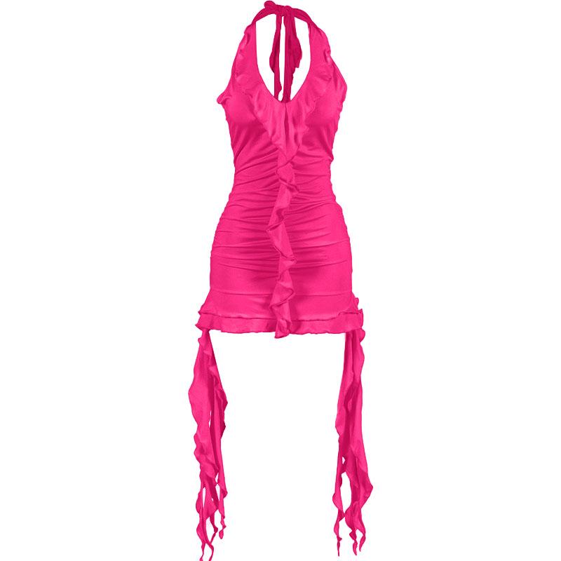 Self tie halter ruffle ruched v neck ribbon backless mini dress