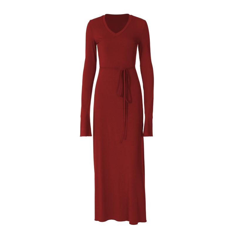 Self tie solid long sleeve v neck ruffle maxi dress