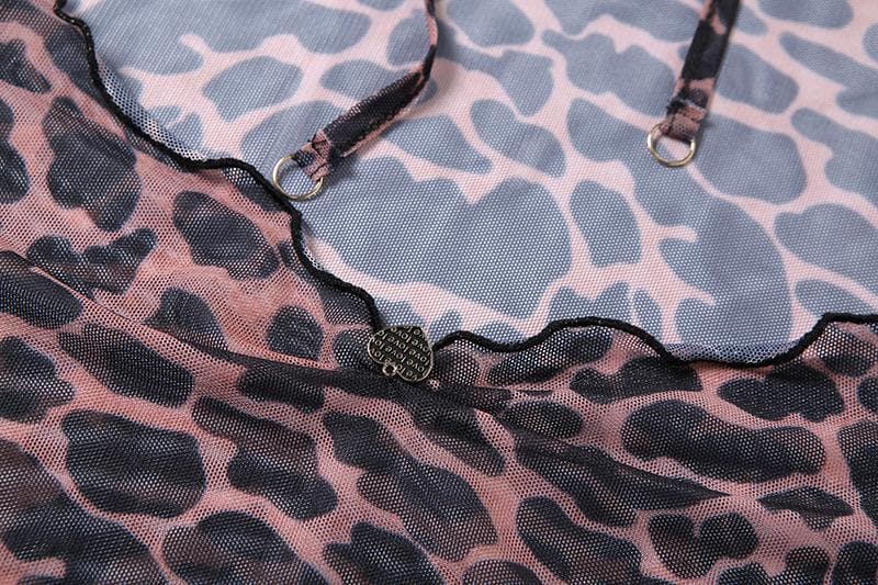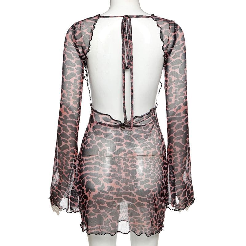 Sheer mesh leopard print contrast see through self tie backless mini dress