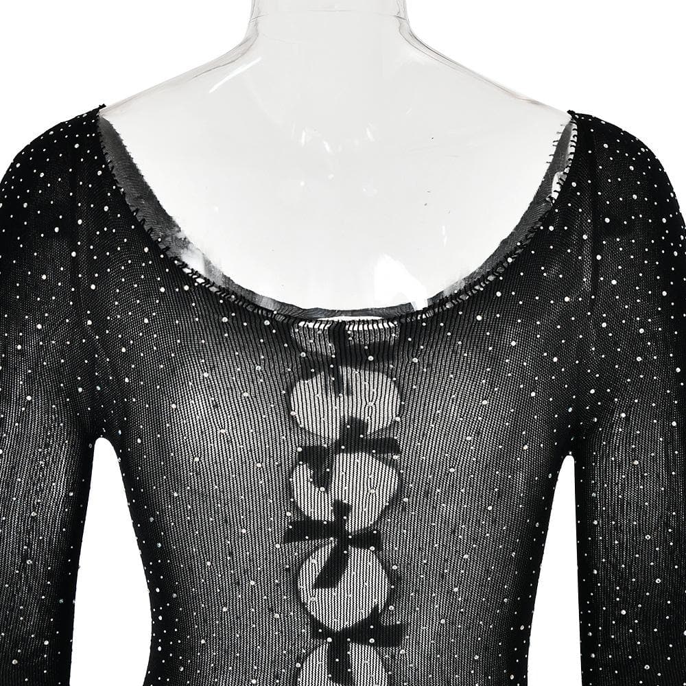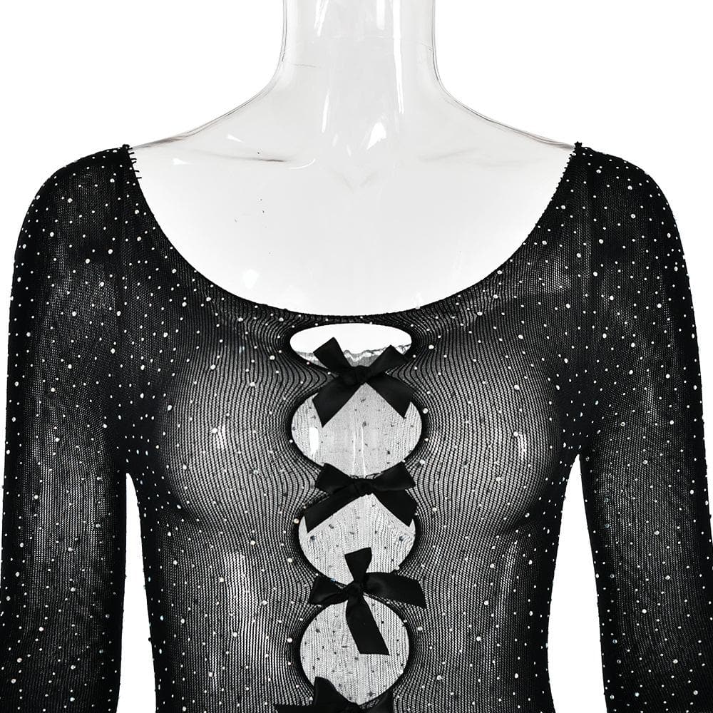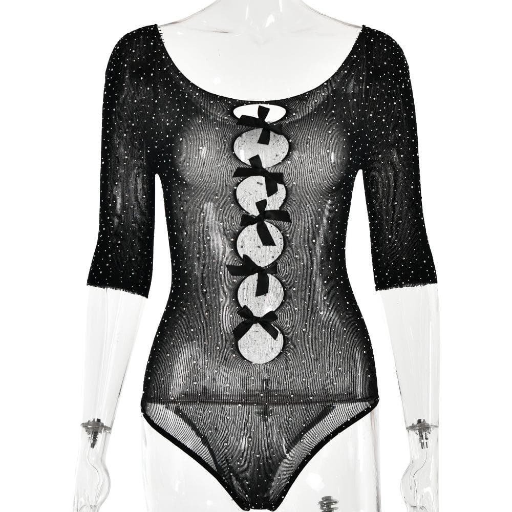 Sheer mesh see through beaded hollow out bowknot bodysuit