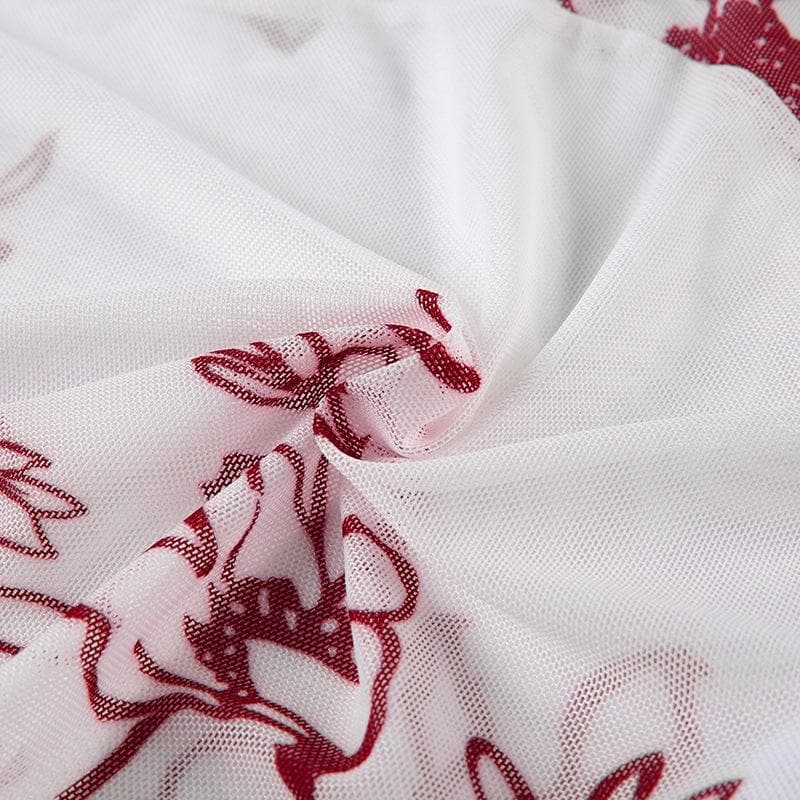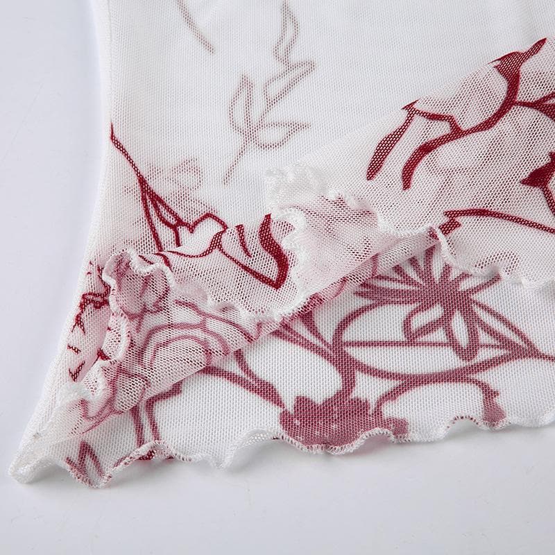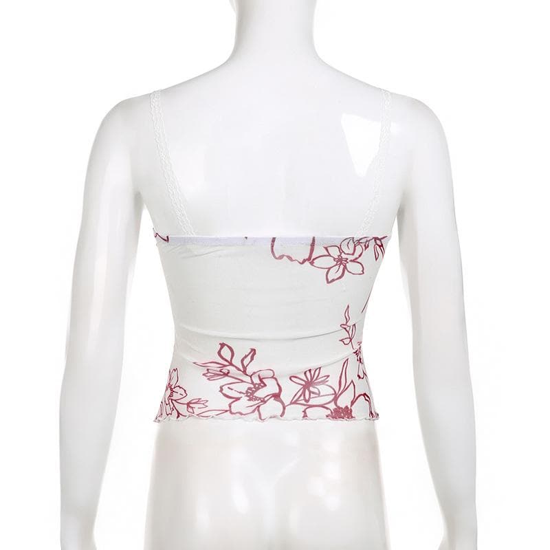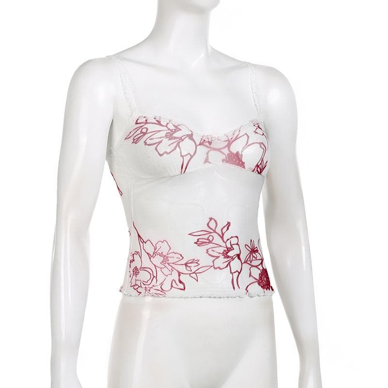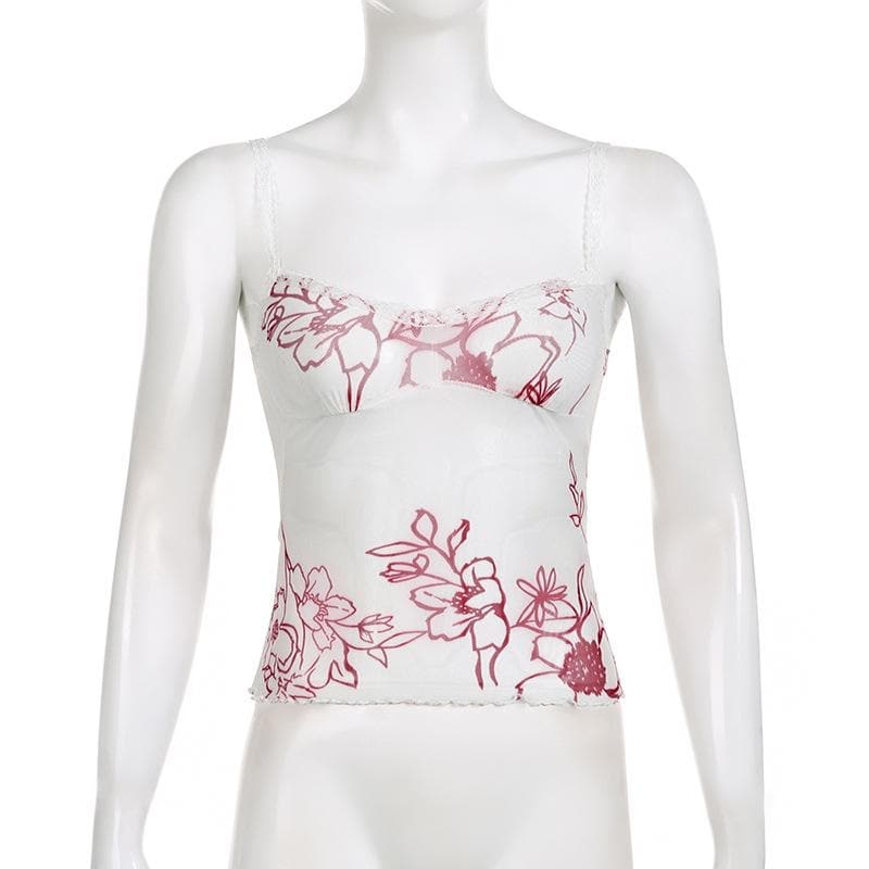Sheer mesh see through flower print sleeveless lace hem crop top