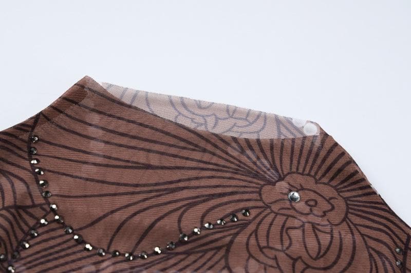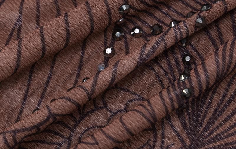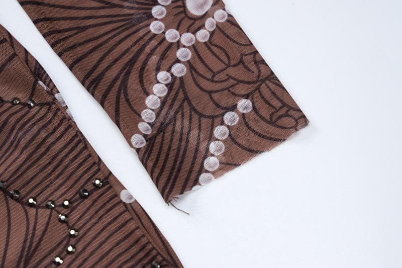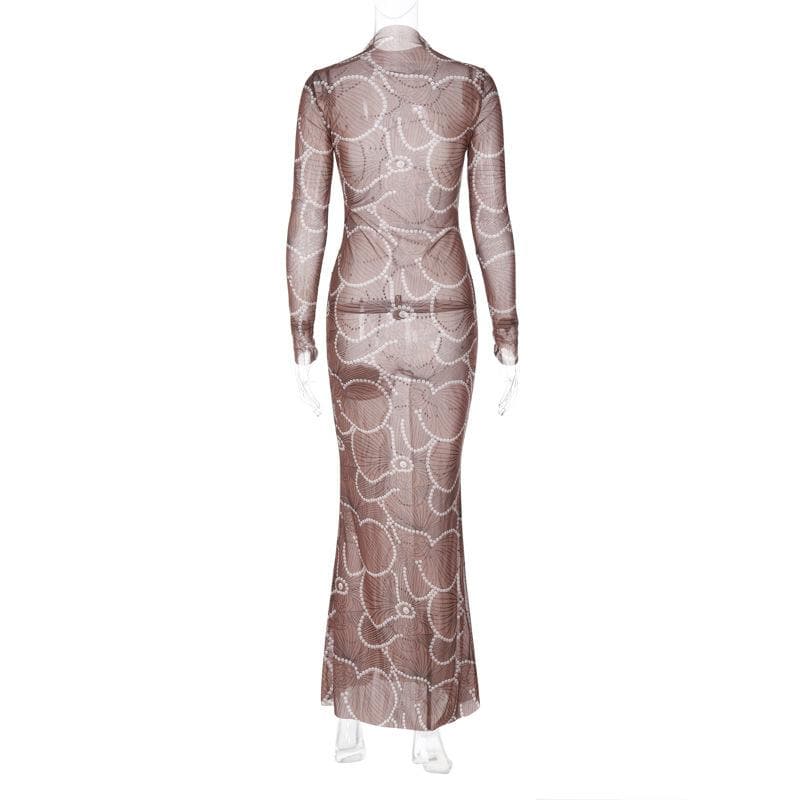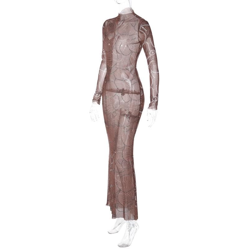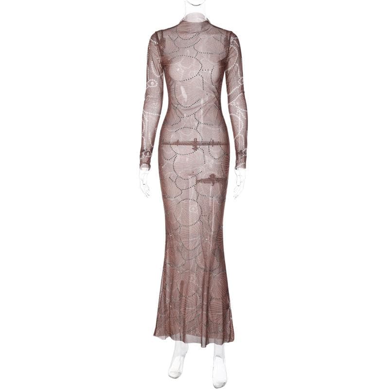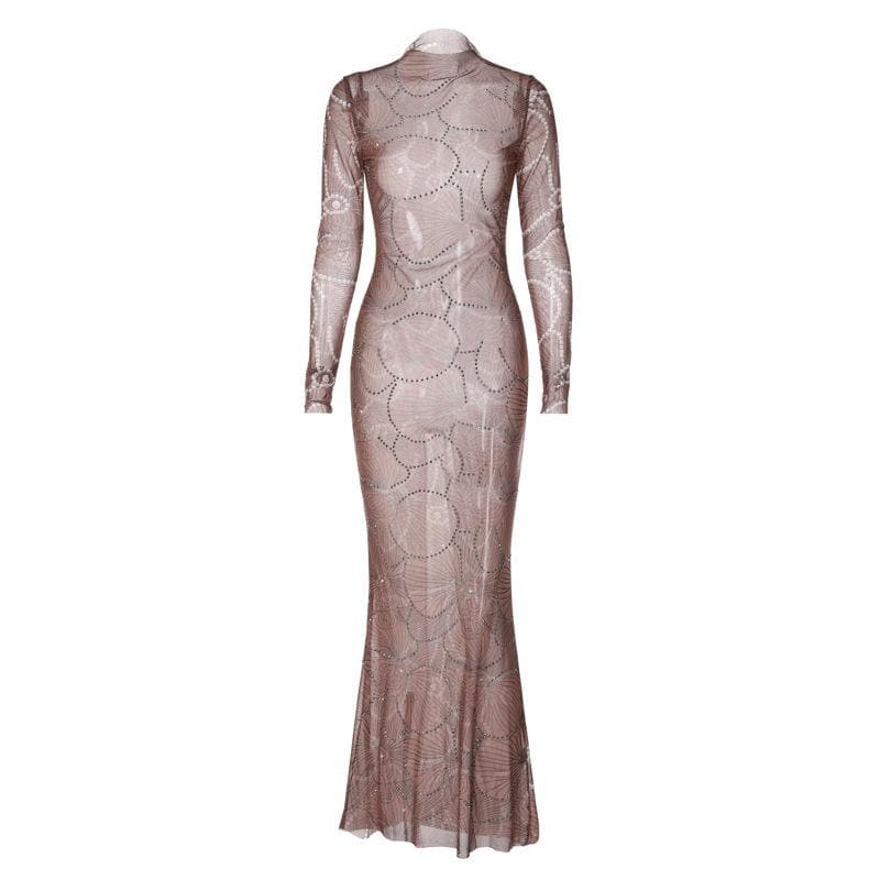 Sheer mesh see through high neck long sleeve beaded maxi dress