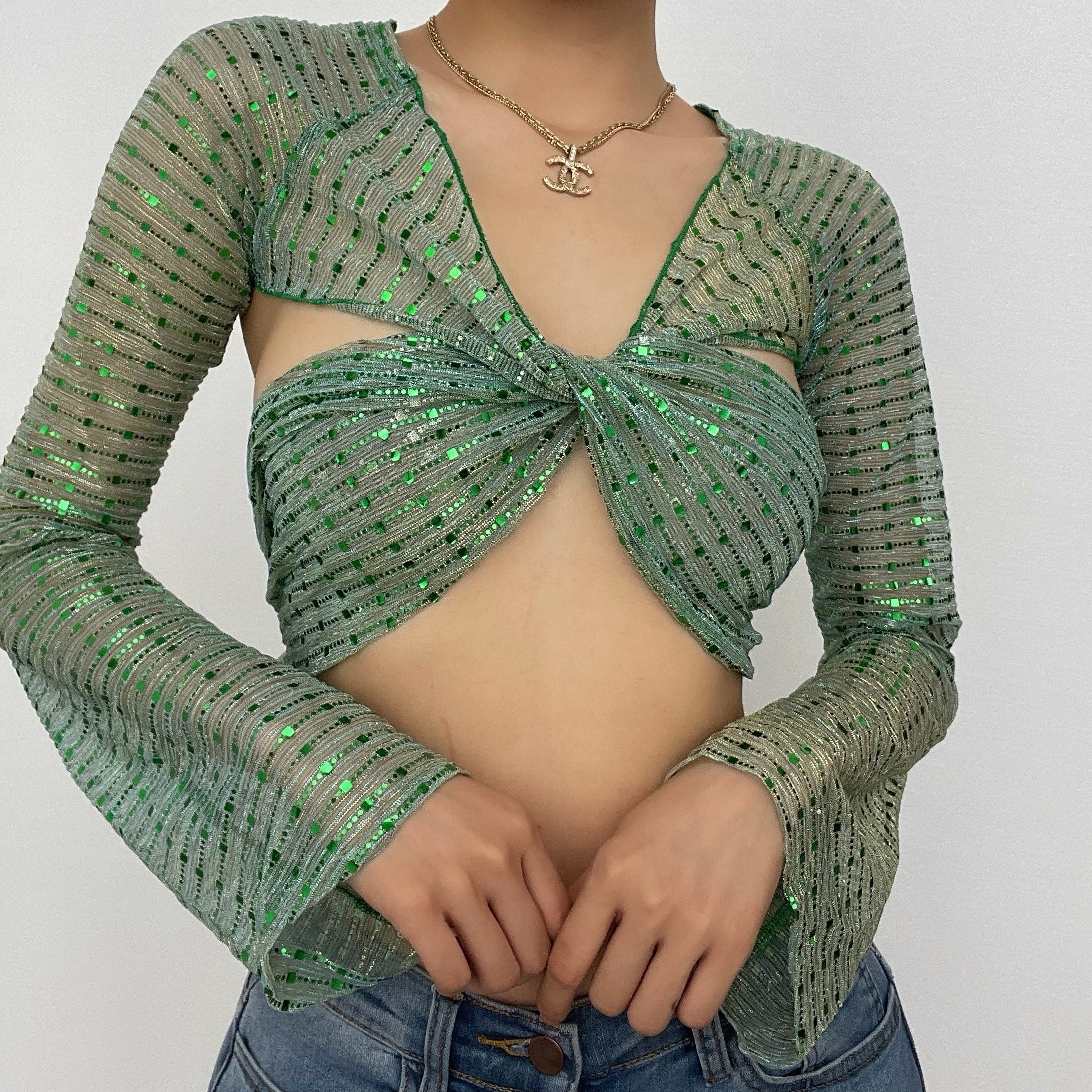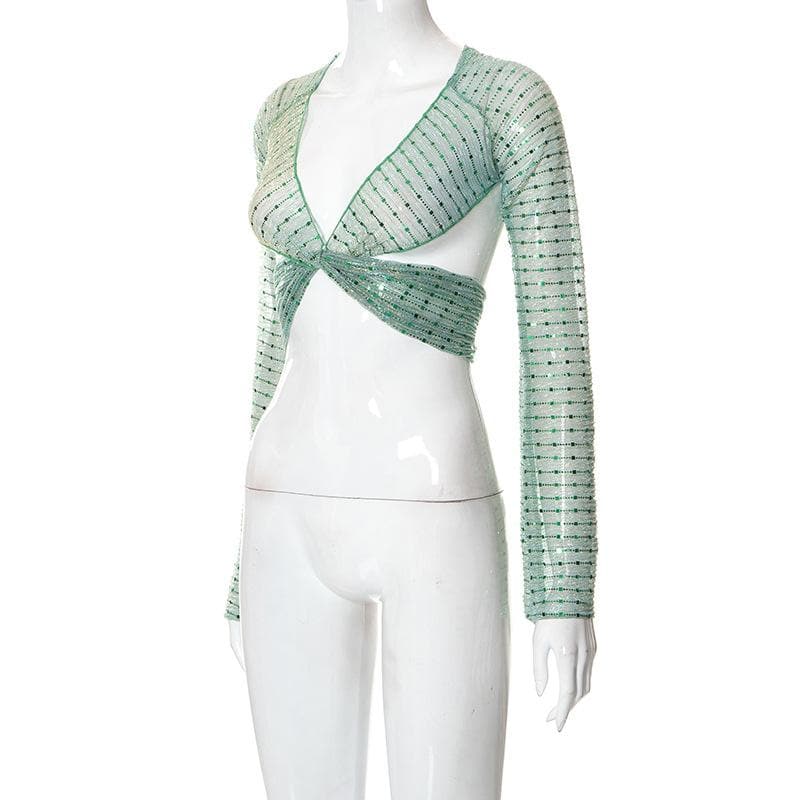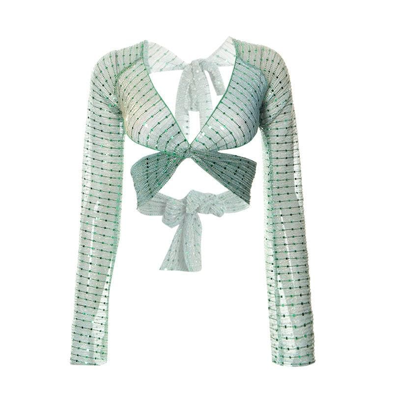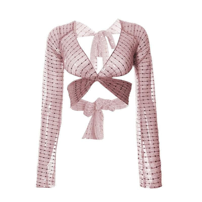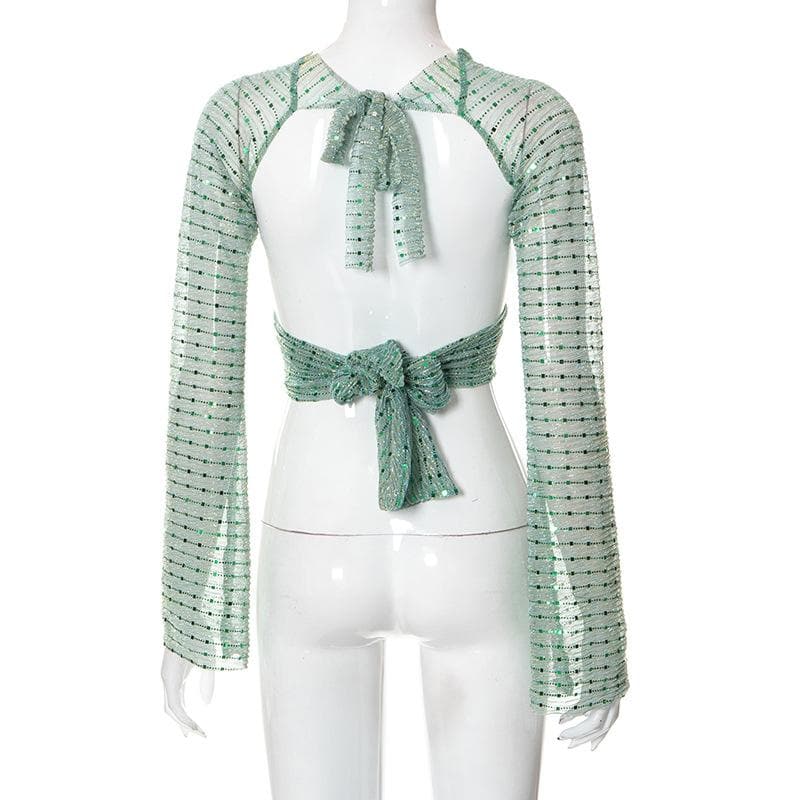 Sheer mesh see through knotted self tie long sleeve glitter crop top