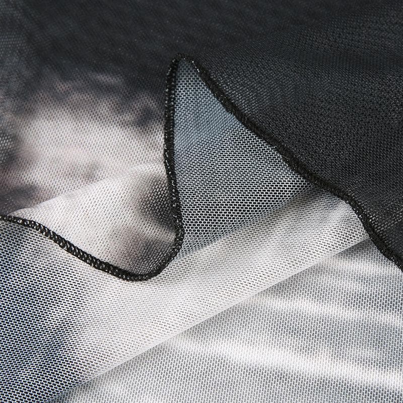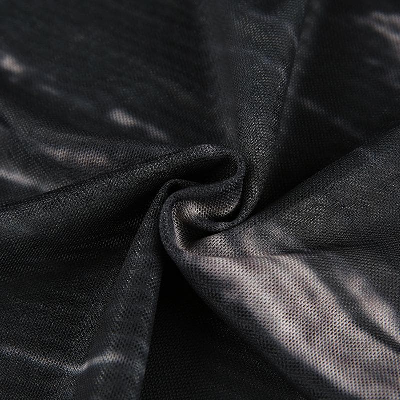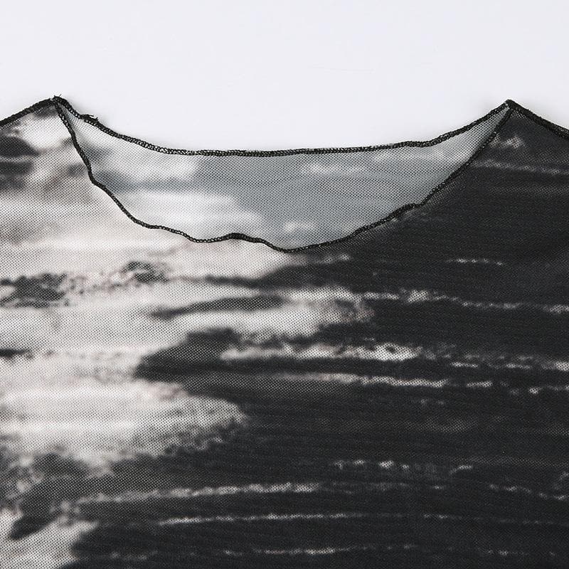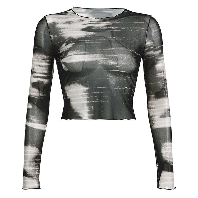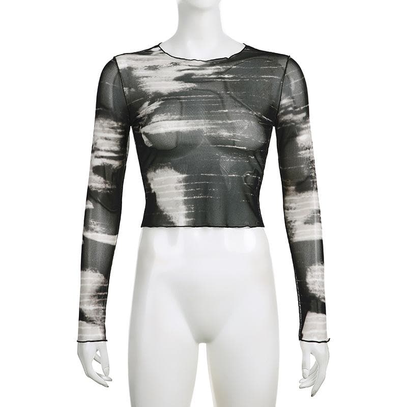 Sheer mesh see through ruffle long sleeve tie dye crop top