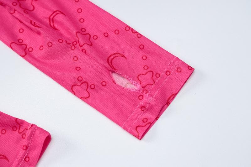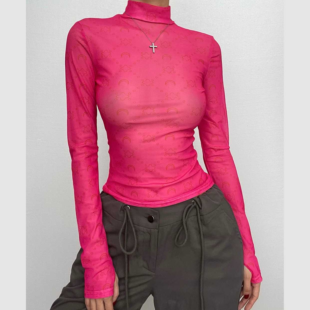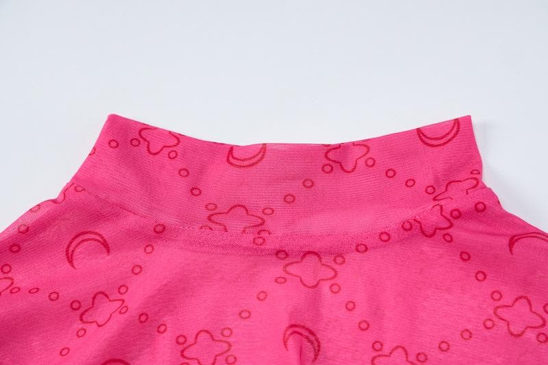 Sheer mesh see through solid long sleeve gloves print high neck top