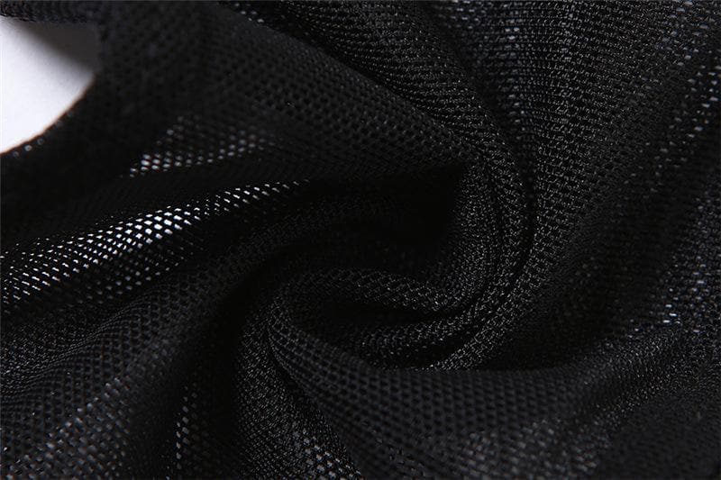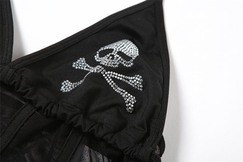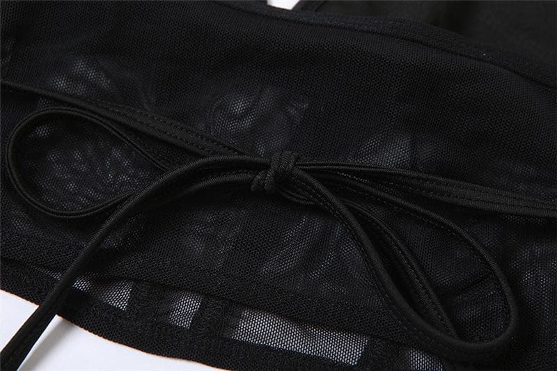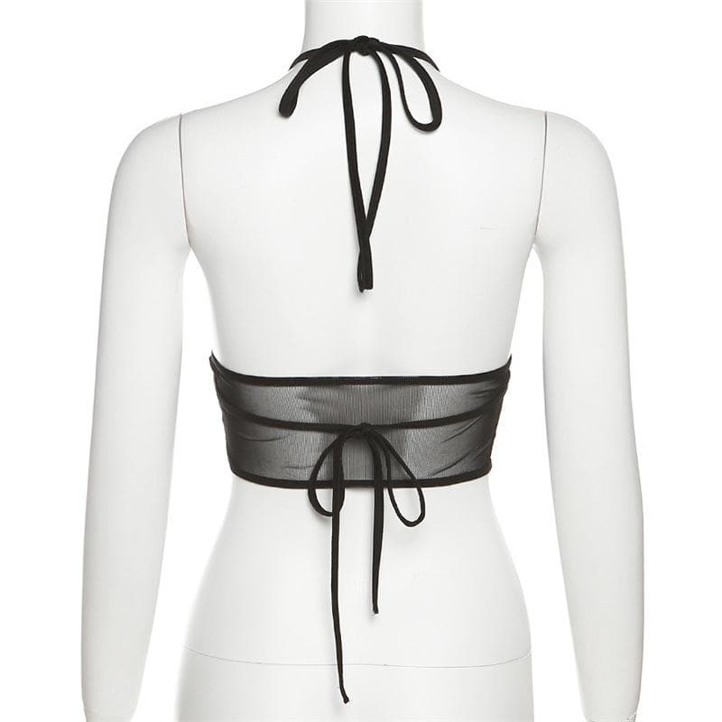 Skull beaded contrast mesh halter v neck self tie backless crop top
