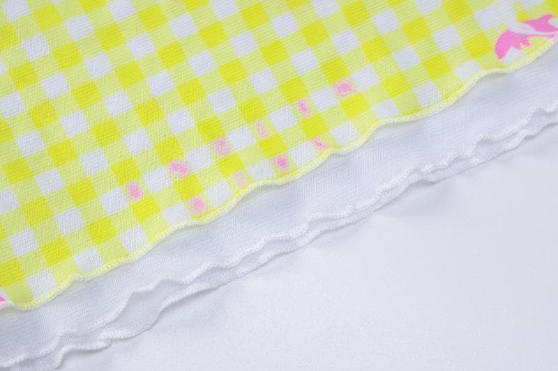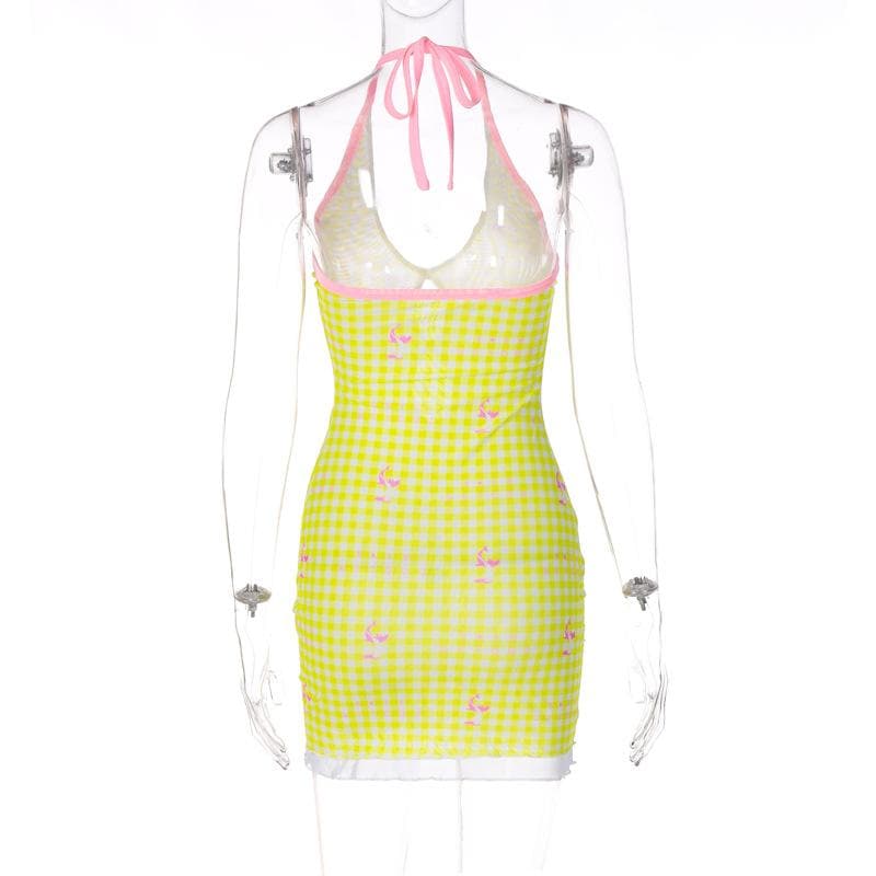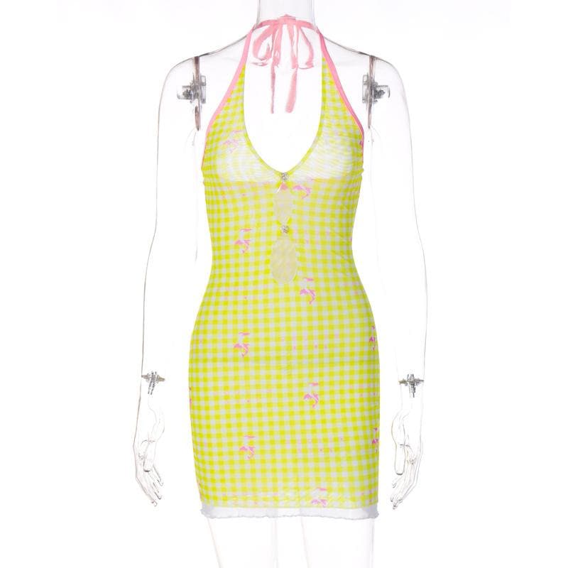 Sheer mesh plaid contrast print halter ruffle backless mini dress