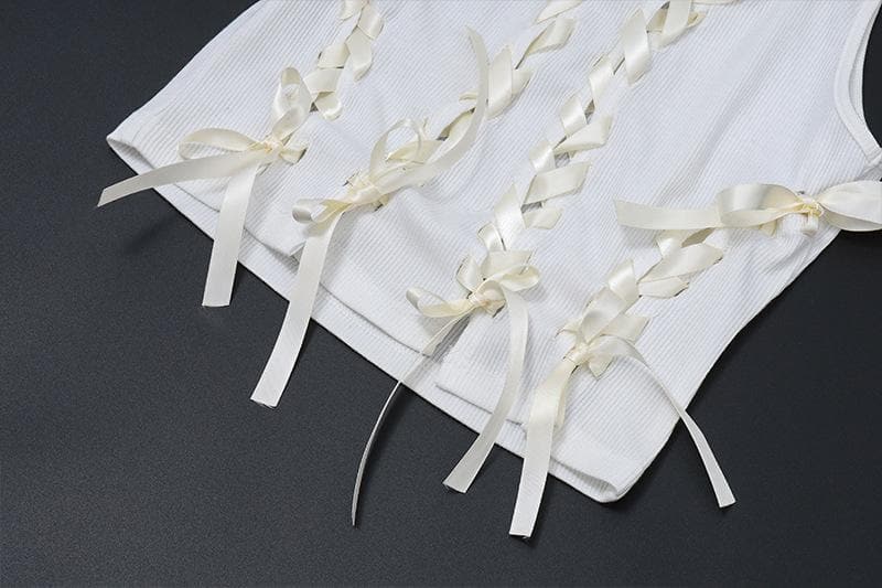 Sleeveless round neck lace up hollow out ribbed crop cut out top