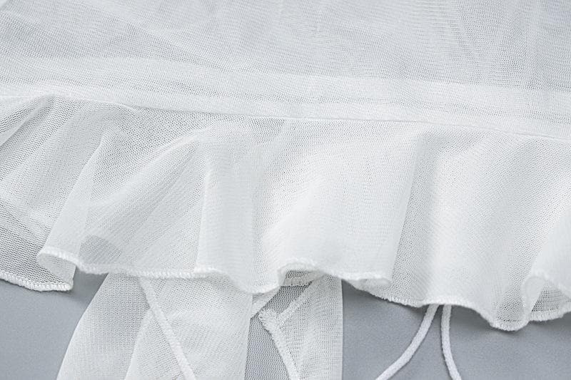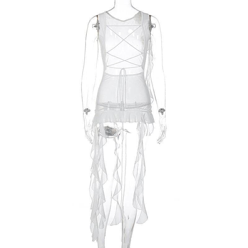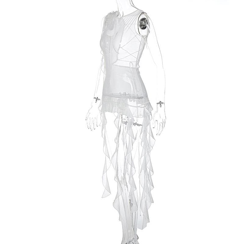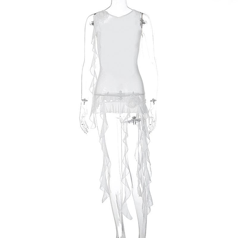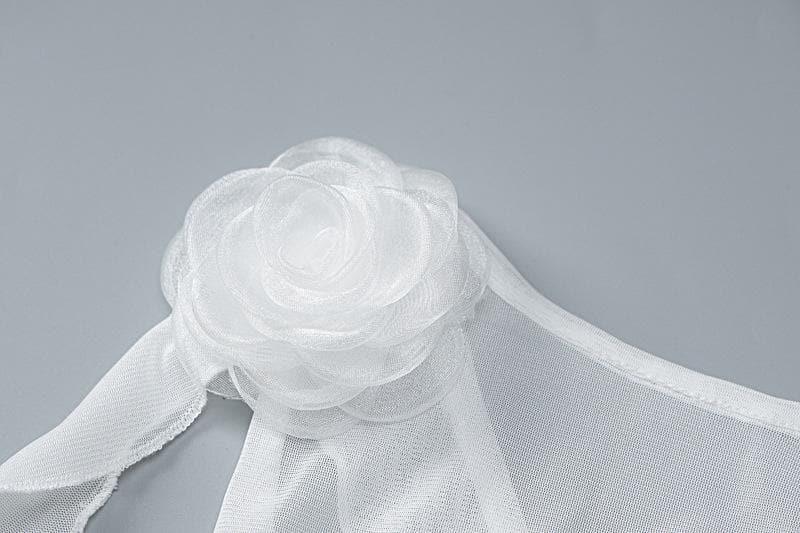 Sleeveless solid cross back sheer mesh see through ruffle flower applique top