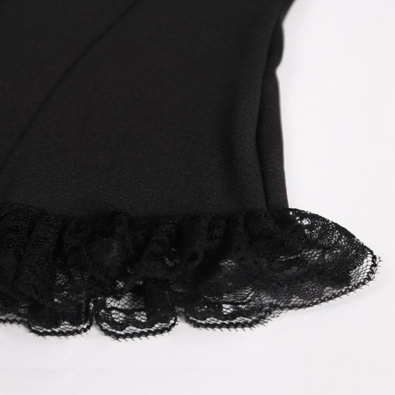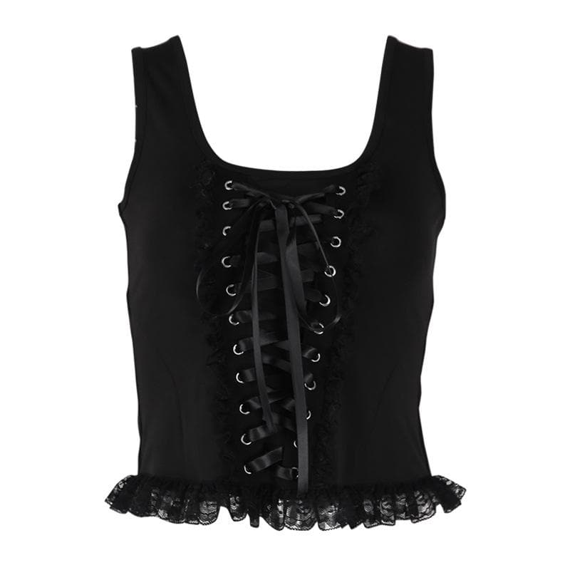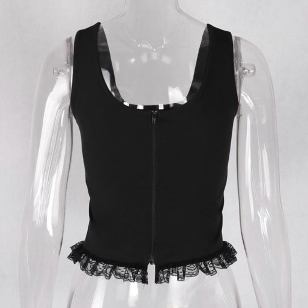 Sleeveless solid lace up zip-up lace hem self tie crop top